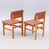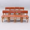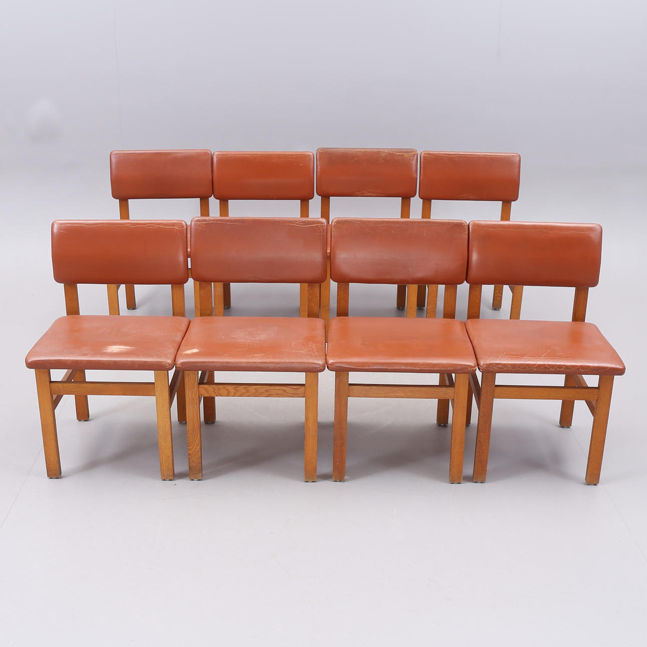 Bruksslitage, fläckar trästomme, skinnklädsel med slitage, skador, vissa stolar med torkad stoppning.