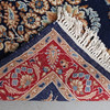 Blå bottenfärg, dekor med balnd annat blommor.