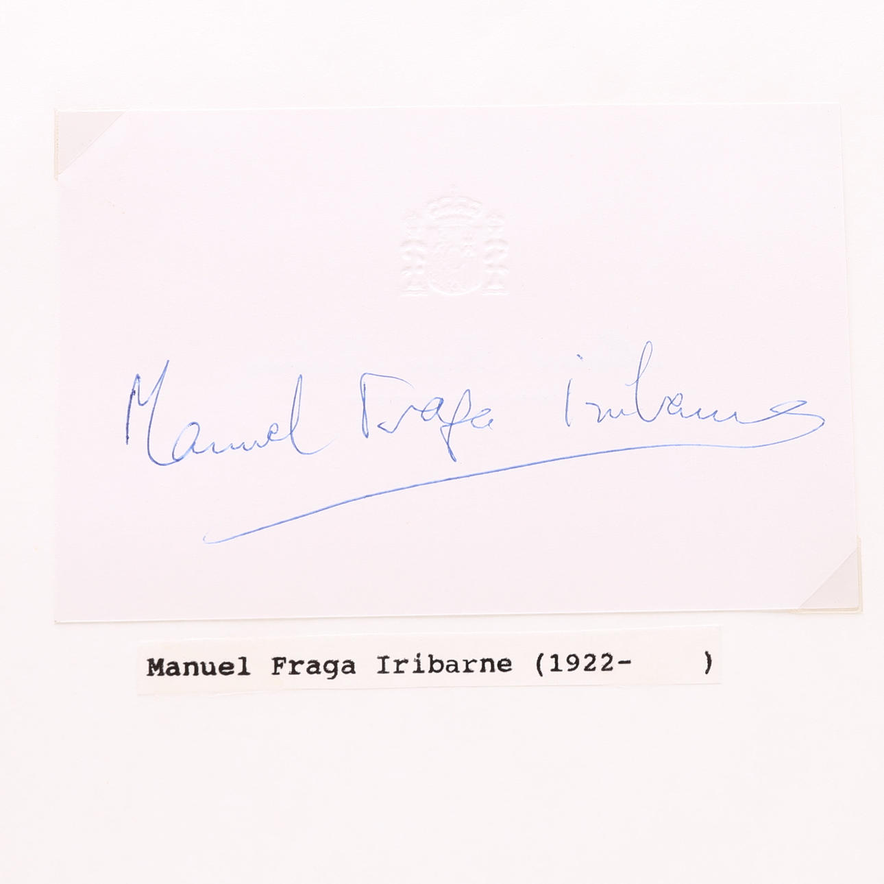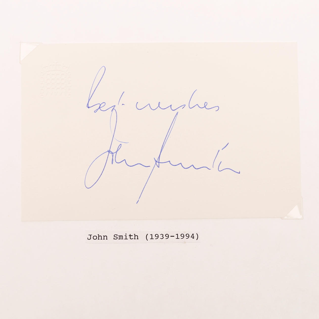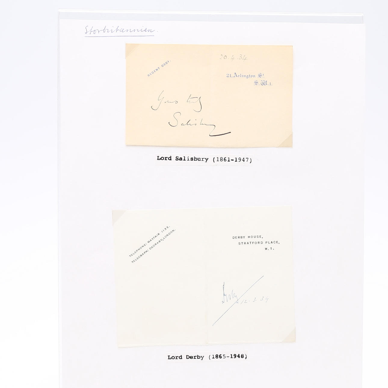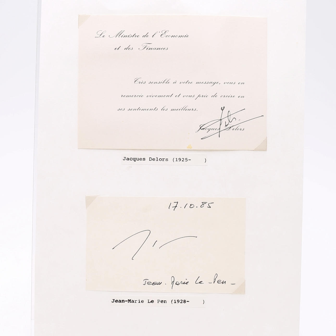 Svend Auken – Danmark, Jacques Delors – Frankrike, Jean-Marie Le Pen – Frankrike, Georges Marchias – Frankrike, Somon Veil – Frankrike, Ahmed Yamani – Saudiarabien, Manuel Fraga Iribarne – Spanien, Lord Young – Storbritannien, William Rodgers – Storbritannien, Lord Salisbury – Storbritannien, Lord Derby – Storbritannien, John Smith – Storbritannien, Otto Graf Lambsdorff, Rudolf Scharping, Lord Longford, Paddy Ashdown, Tony Blair, Michael Portillo, Lionel Jospin samt tre okända. -- mäter 9 cm. x 5,5 cm. Proveniens: Sverker Hiort af Ornäs autografsamling.