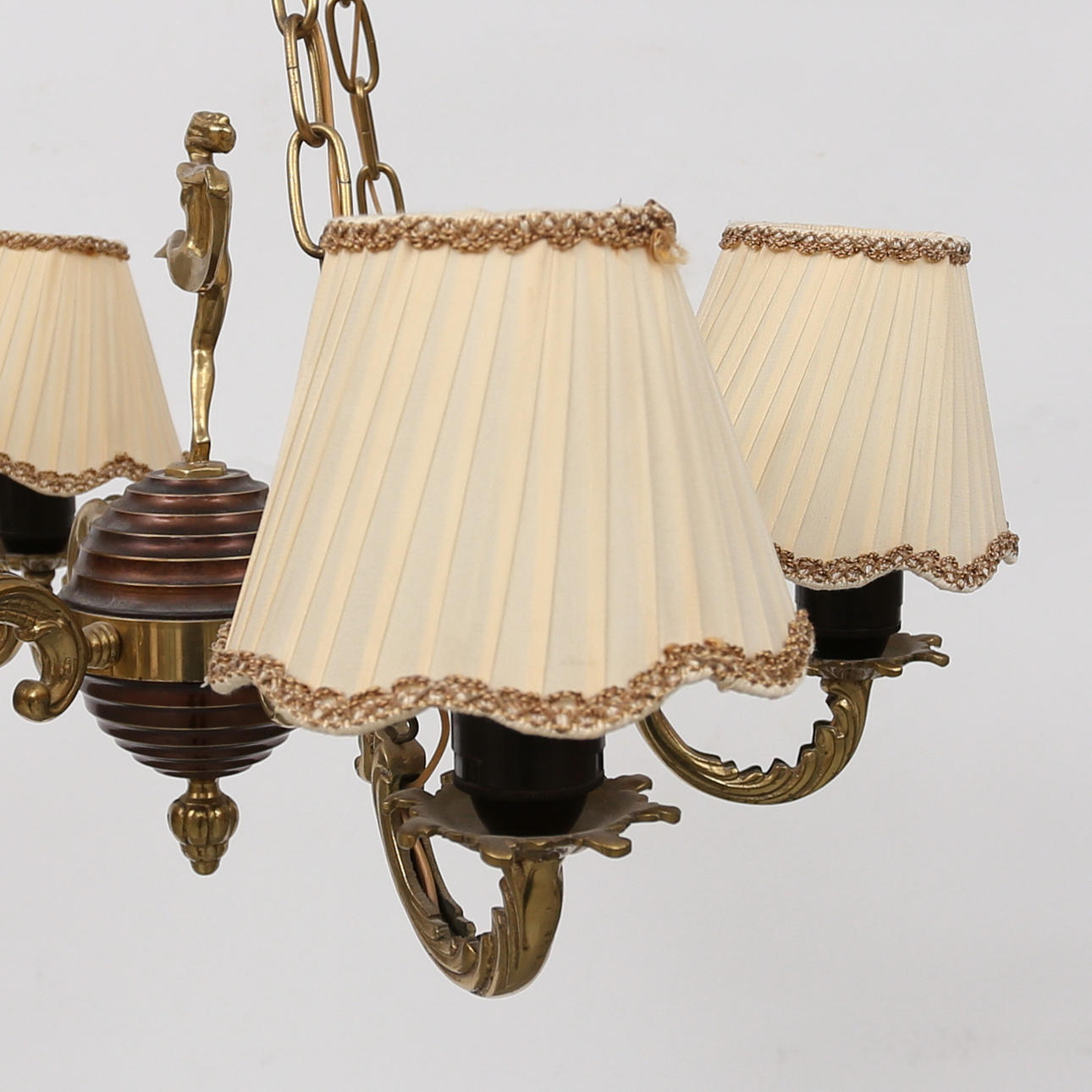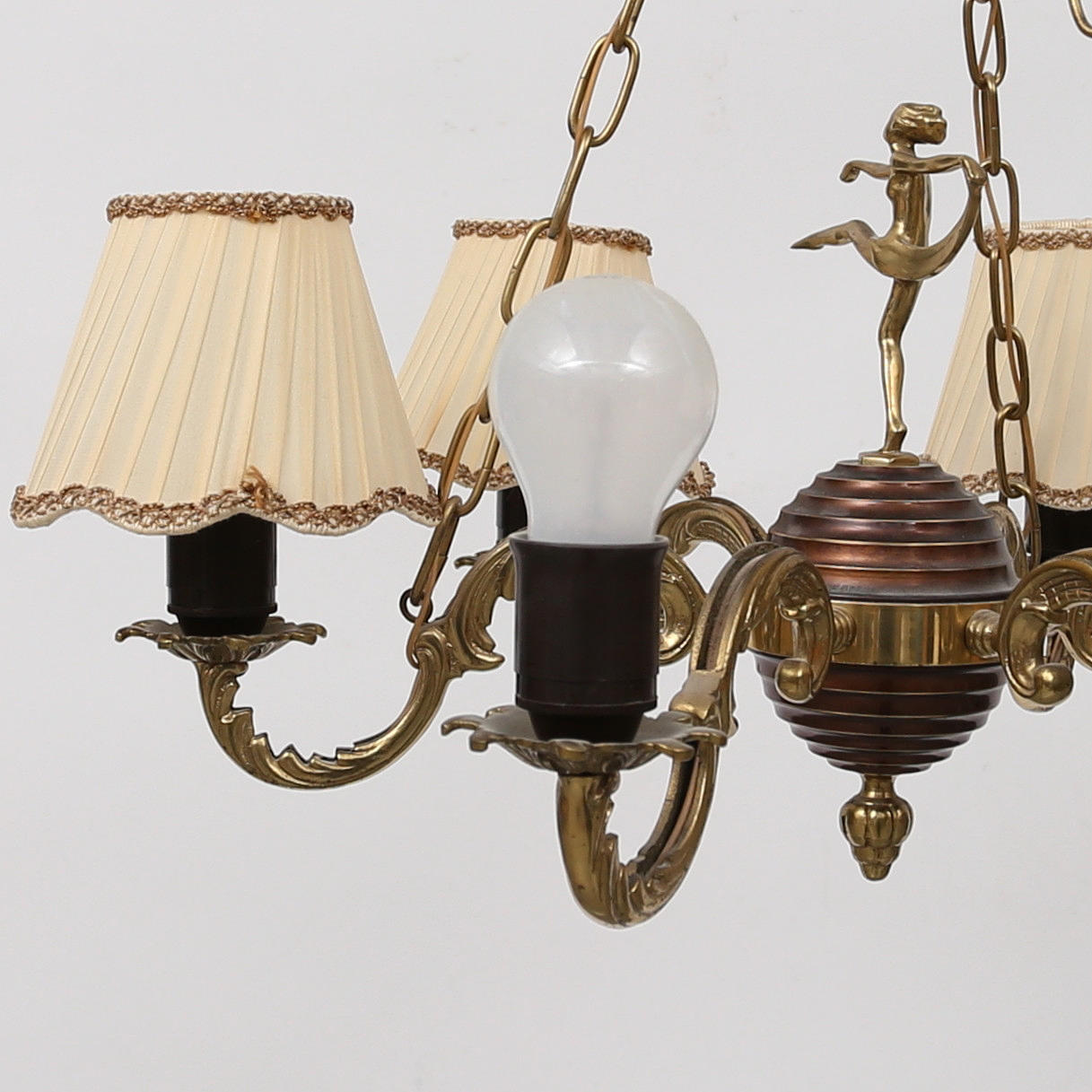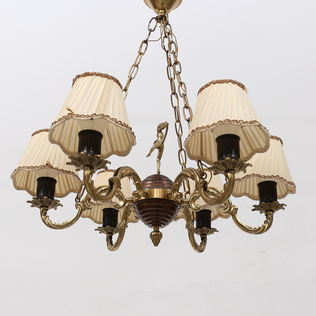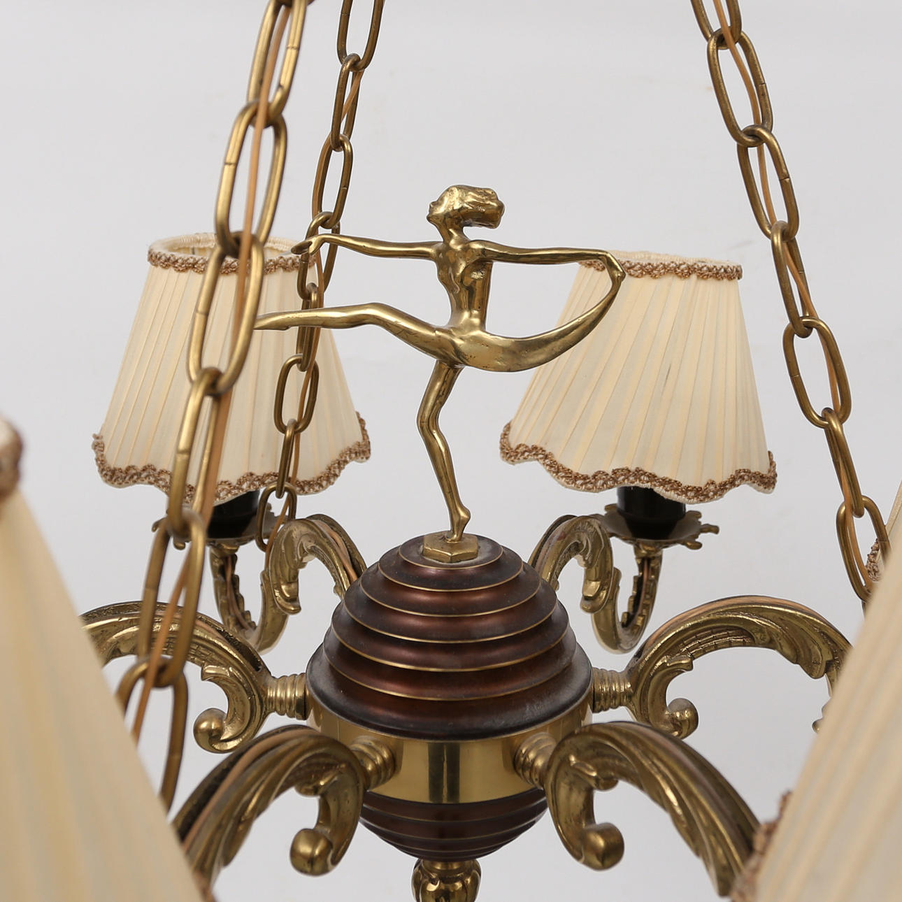 6-armad lampkrona, dekor av klot med dansande kvinnofigur, diameter ca55 cm, höjd inklusive upphängning ca 70 cm.