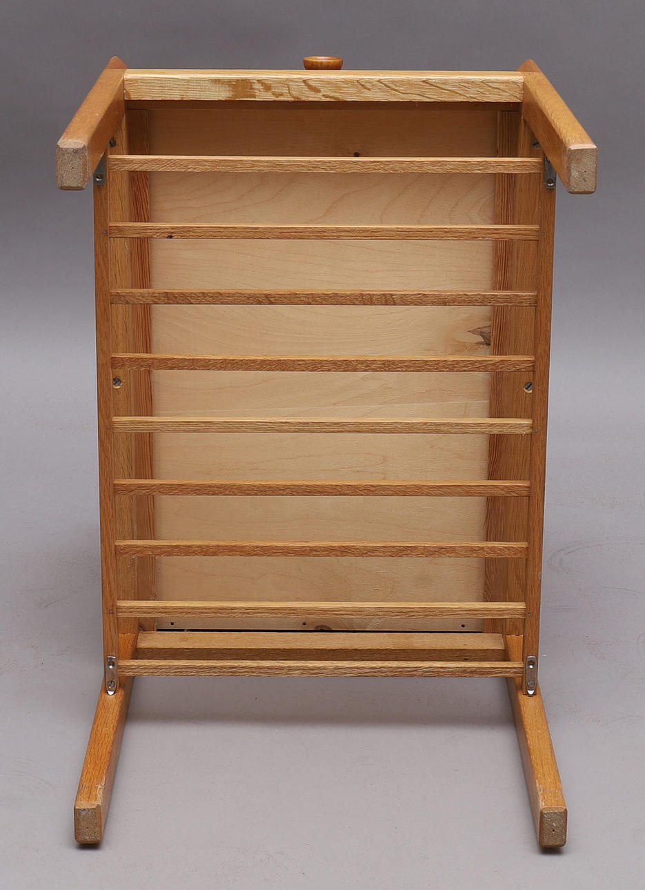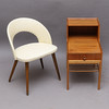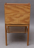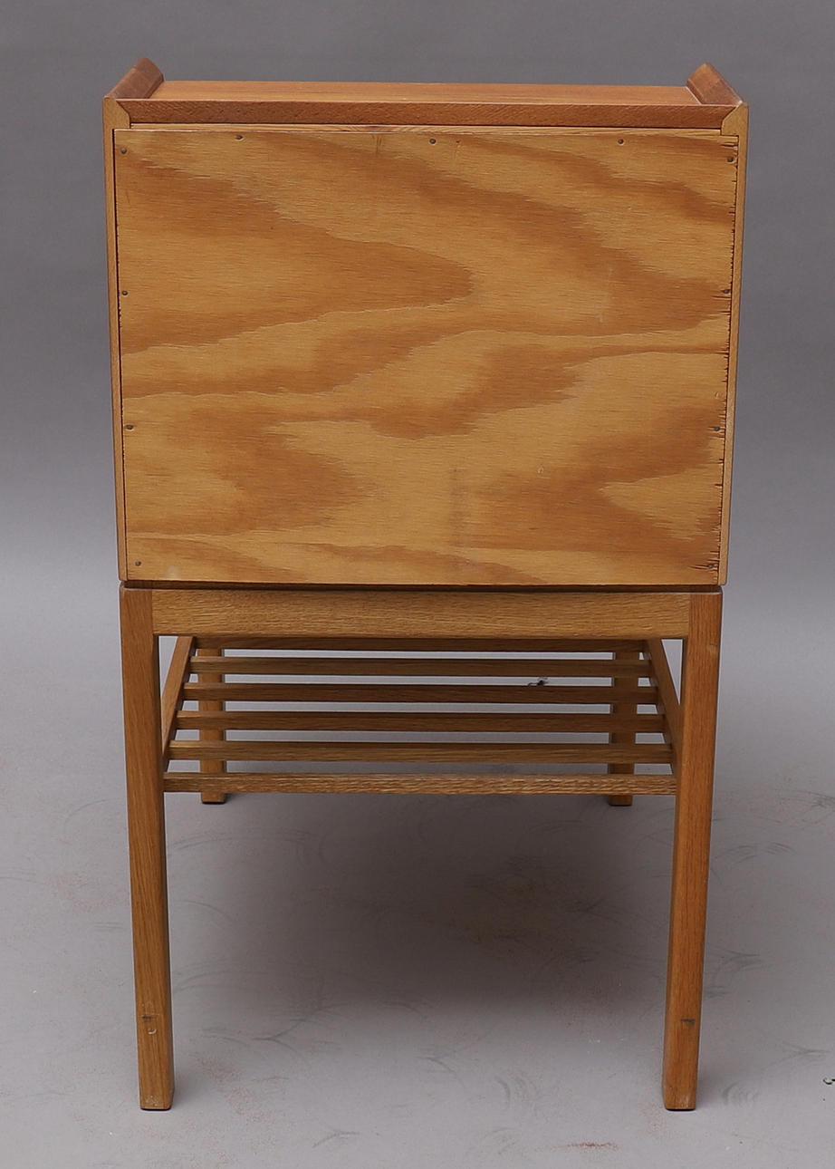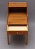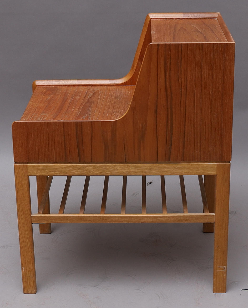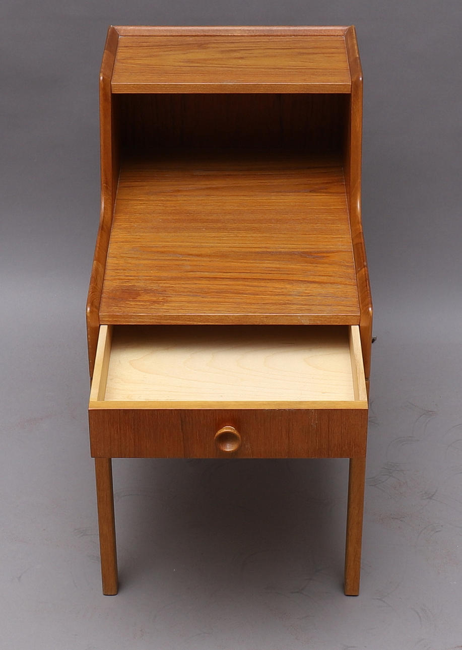 Sängbord, teak och björk, med hylla och låda. Höjd ca 62,5 cm, bredd ca 35 cm, djup ca 50,5 cm