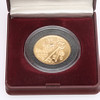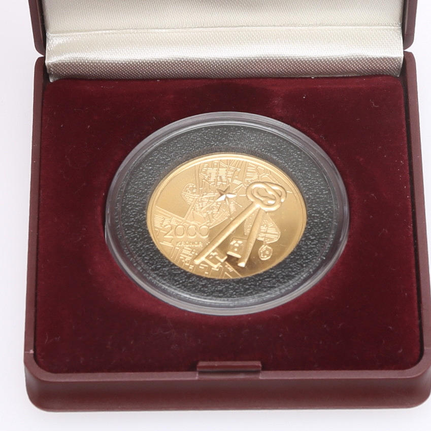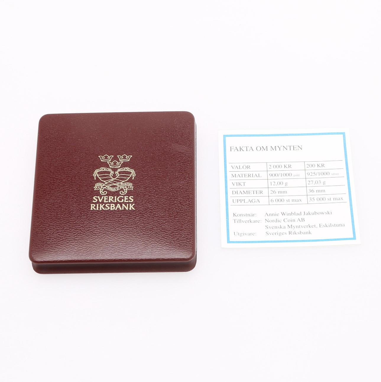 21,6k guld, 900/1000, valör 2000 kr, diameter 26 mm, vikt 12 gram, med etui.