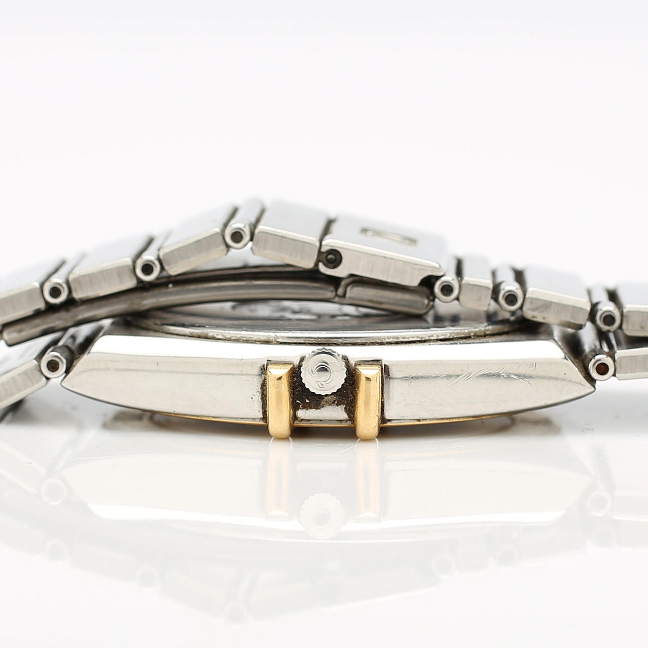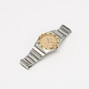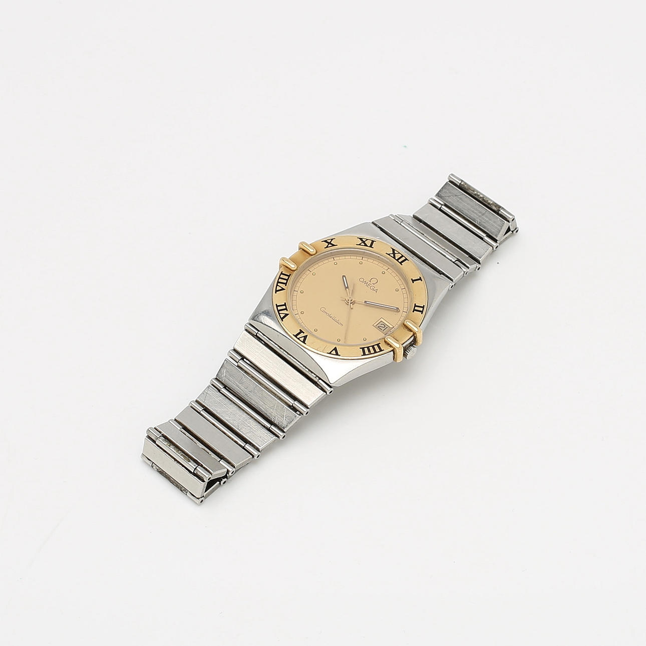 Quartz. Guldfärgad urtavla. Bezel med romerska siffror. Datumfönster. Safirglas. Diameter ca 32 mm. Integrerat armband med viklås.