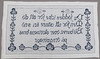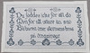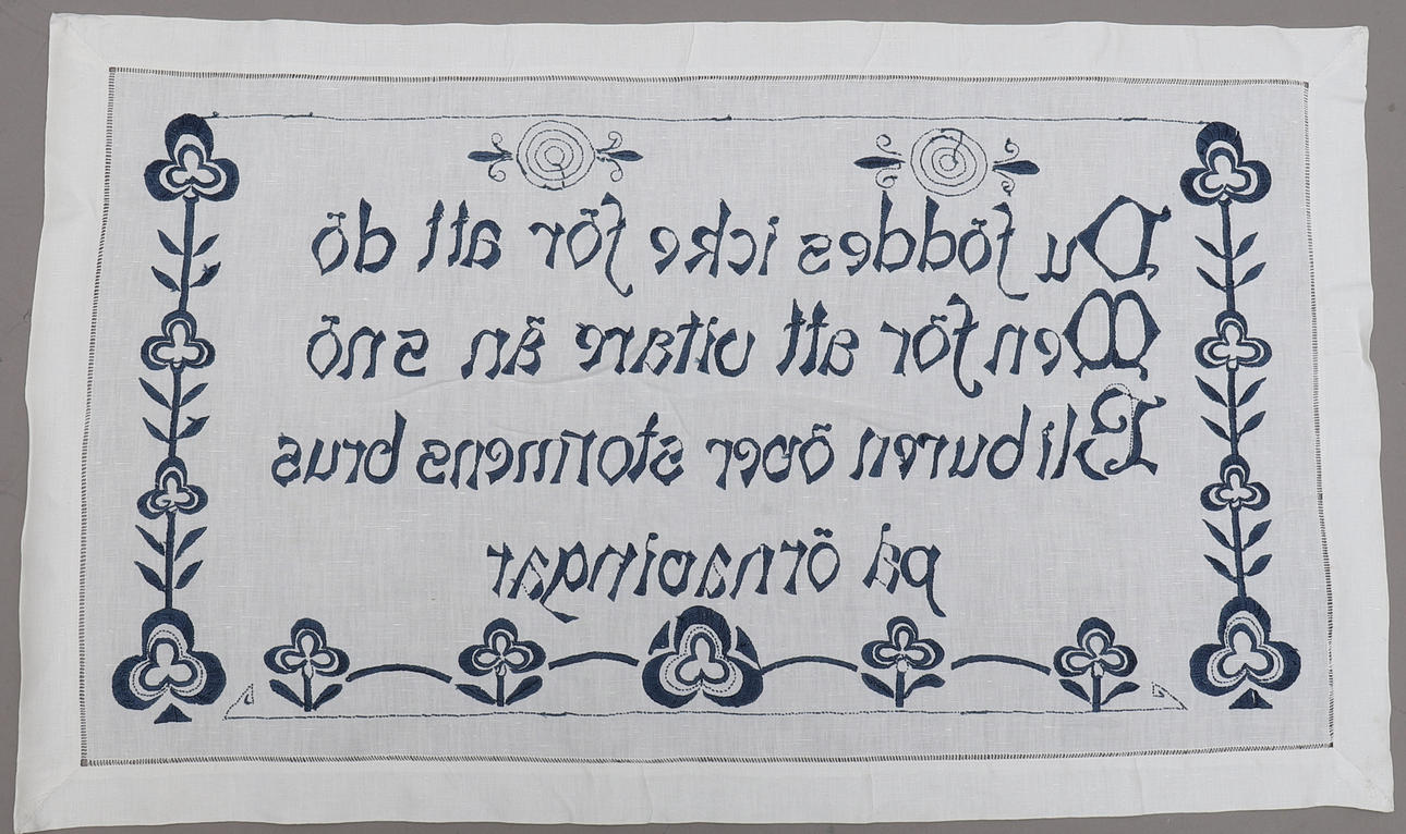 Vit botten med mörkgrön text. Plattsöm i text och blomranka.