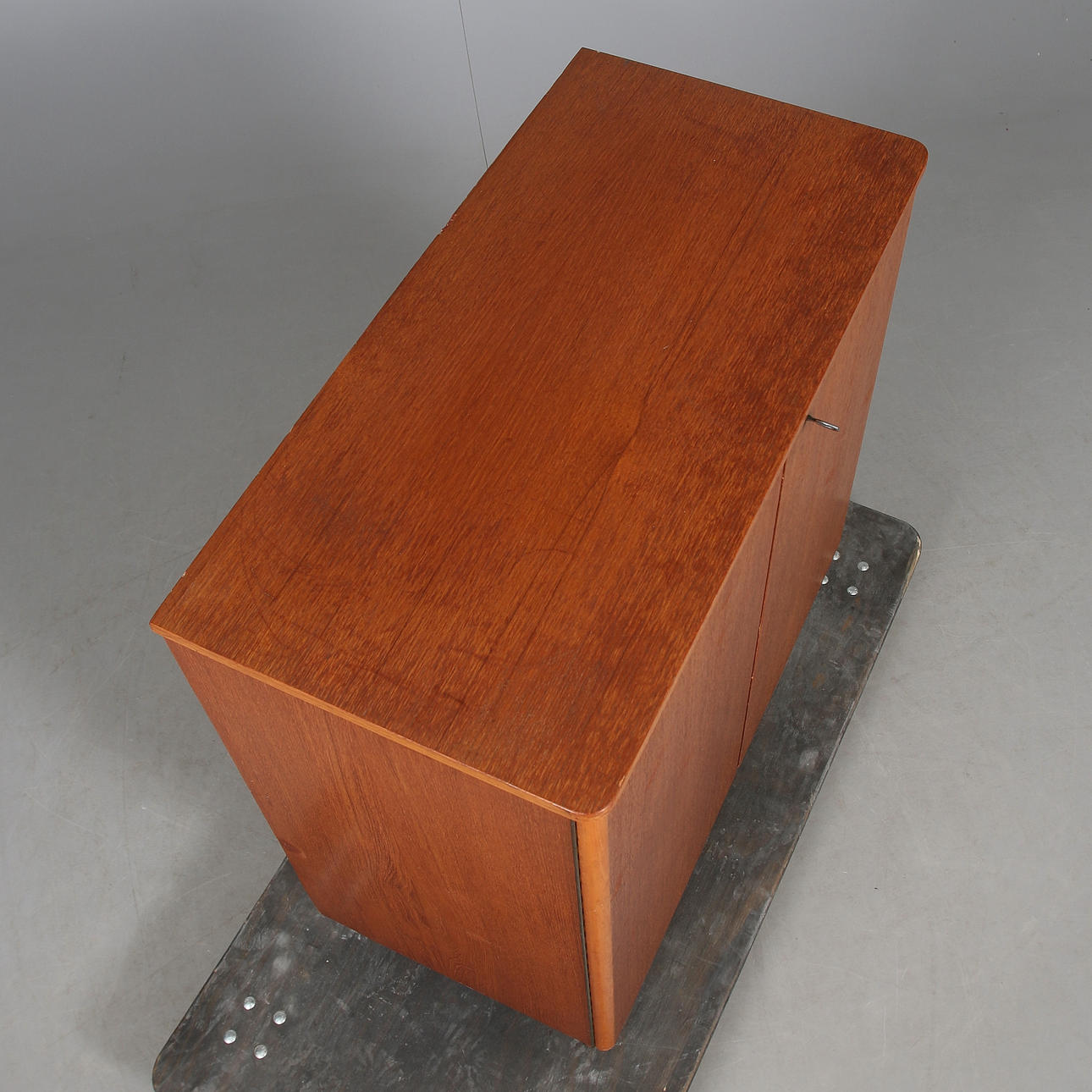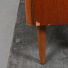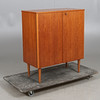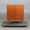Fanérad i teak. Dubbla luckor med bakomliggande inredning. Längd ca. 74, bredd 37, höjd 87 cm.