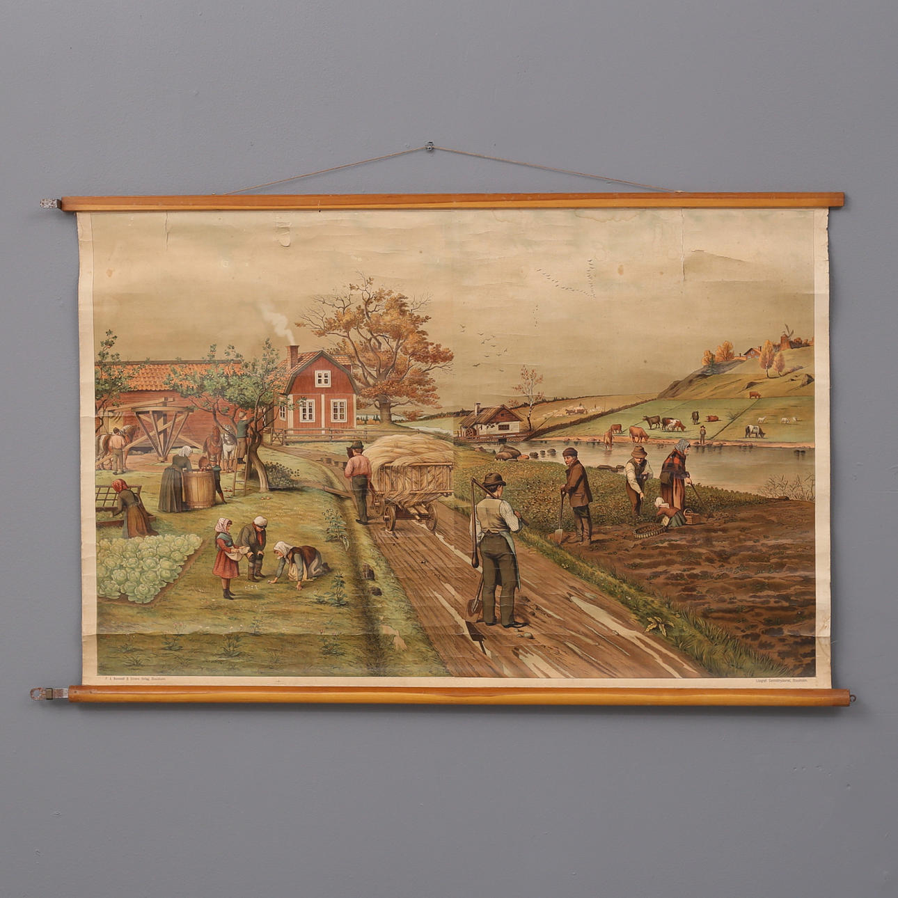 Litografiska tryck på textilduk, Nordsteds och söners förlag, Stockholm, sekelskiftet 18/1900-tal, ca 128x83 cm.