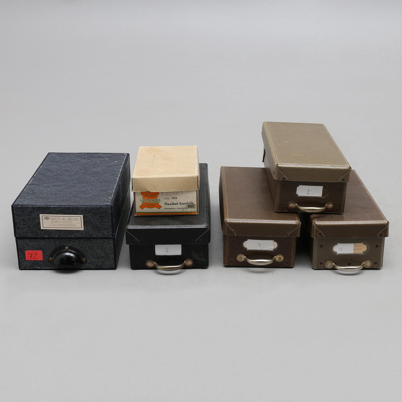6 kartoteklådor med äldre frimärken i pergamentpåsar varav en stor del från Tyskland och Danmark.