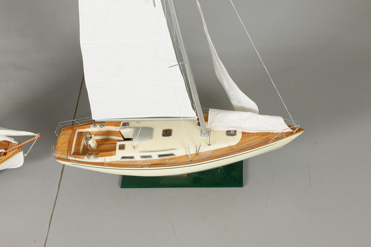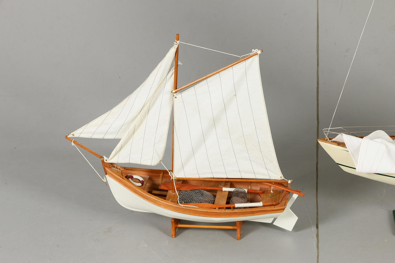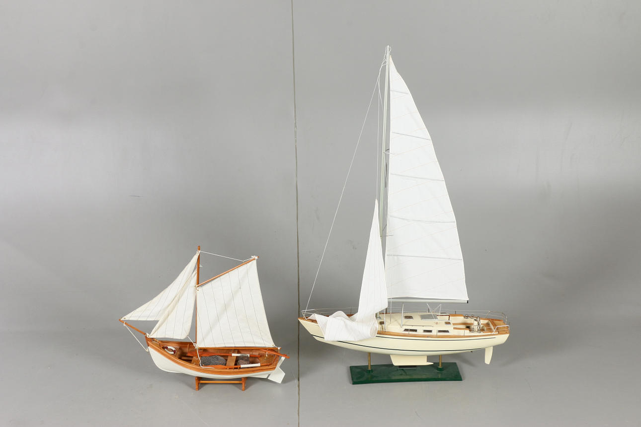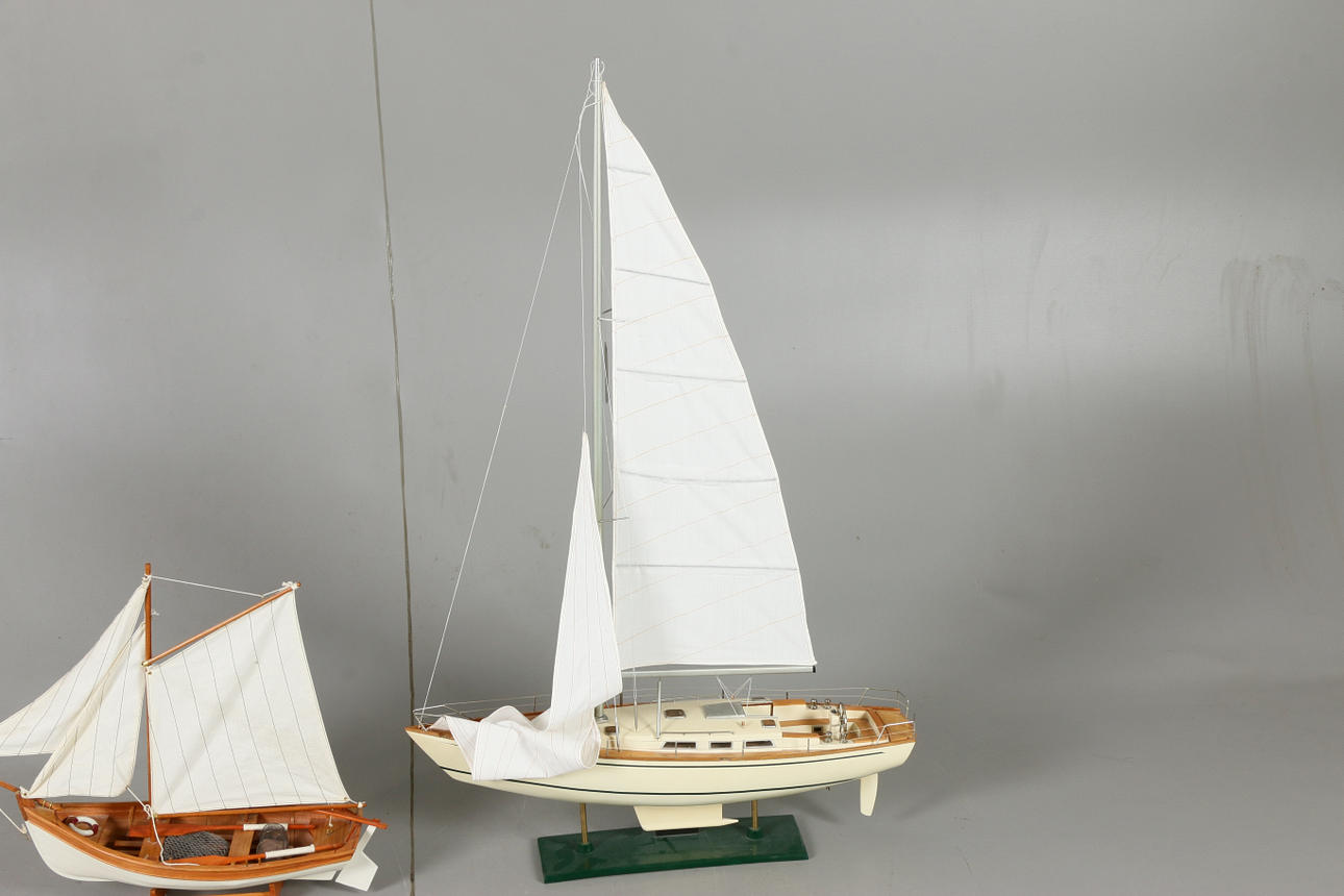 Fiskebåt på sockel Längd 56, höjd 52 cm Segelbåt Omega, på fast sockel Längd 71, höjd 112 cm.