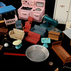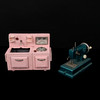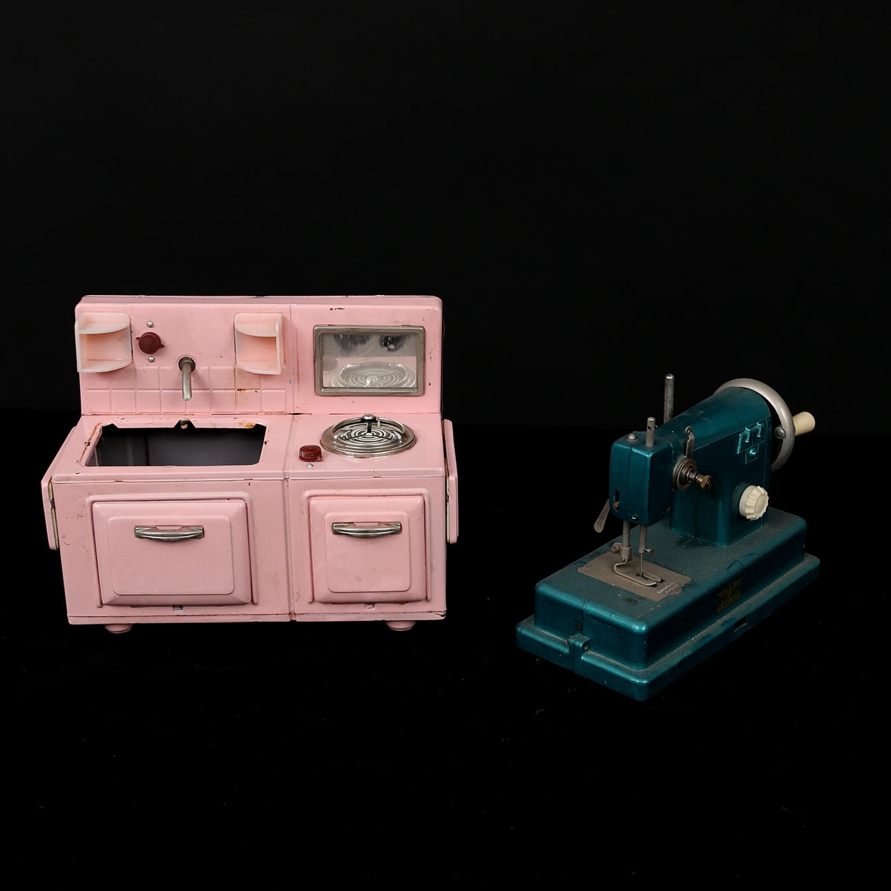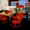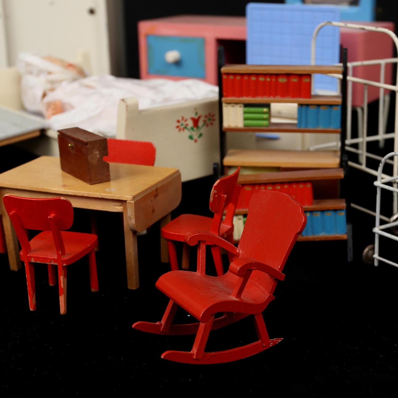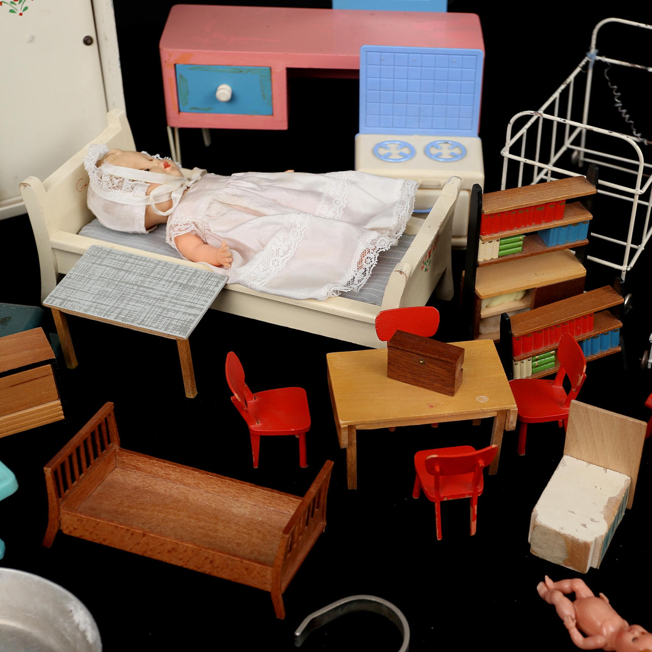 Samling leksaker, 1950/60-tal, tidstypiska möbler till dockskåp, symaskin, docka m.m.