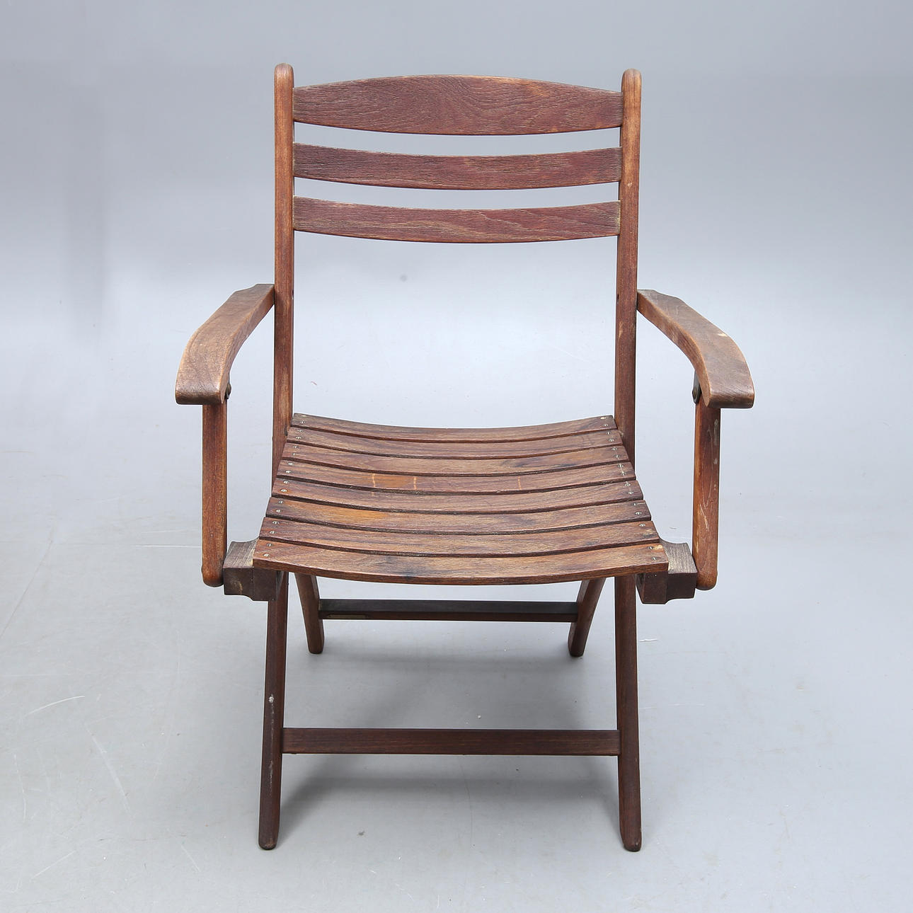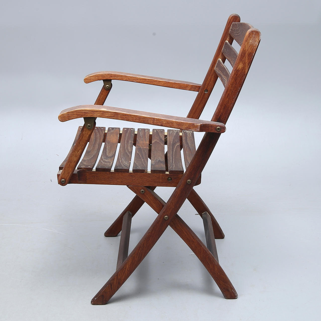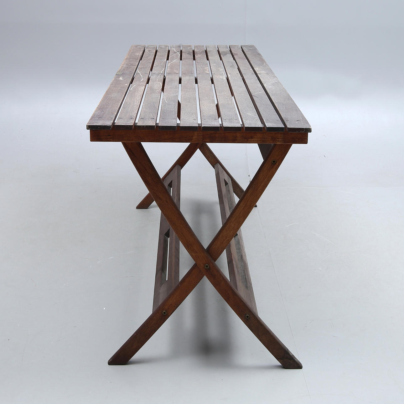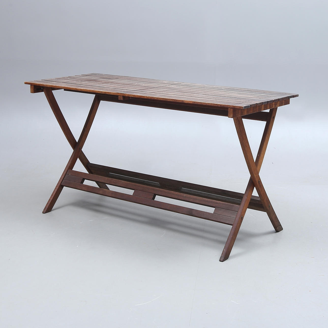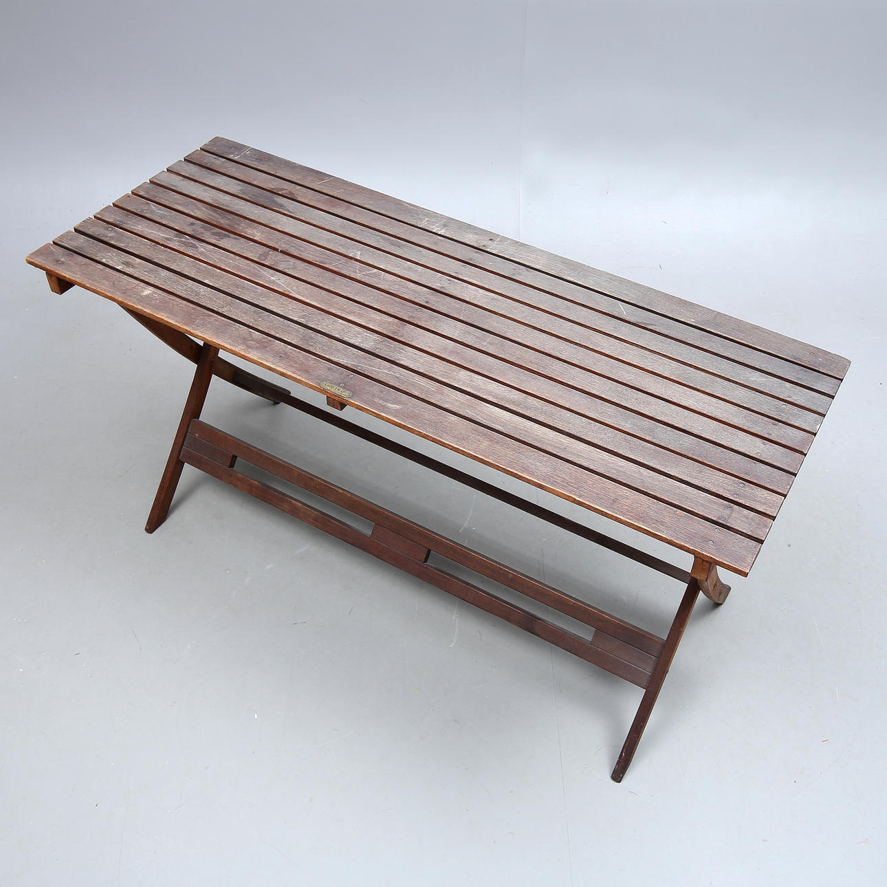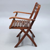 5 stolar, fällbara, märkta, sitthöjd ca 45, rygghöjd ca 86 cm. Bord, fällbart, brickmärkt, längd ca 140, bredd 54, höjd ca 73,5 cm,.