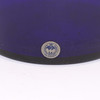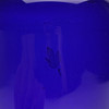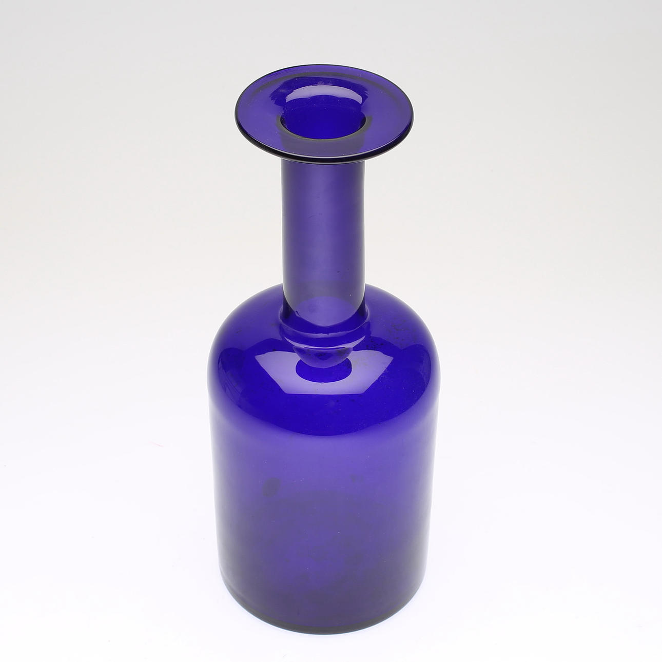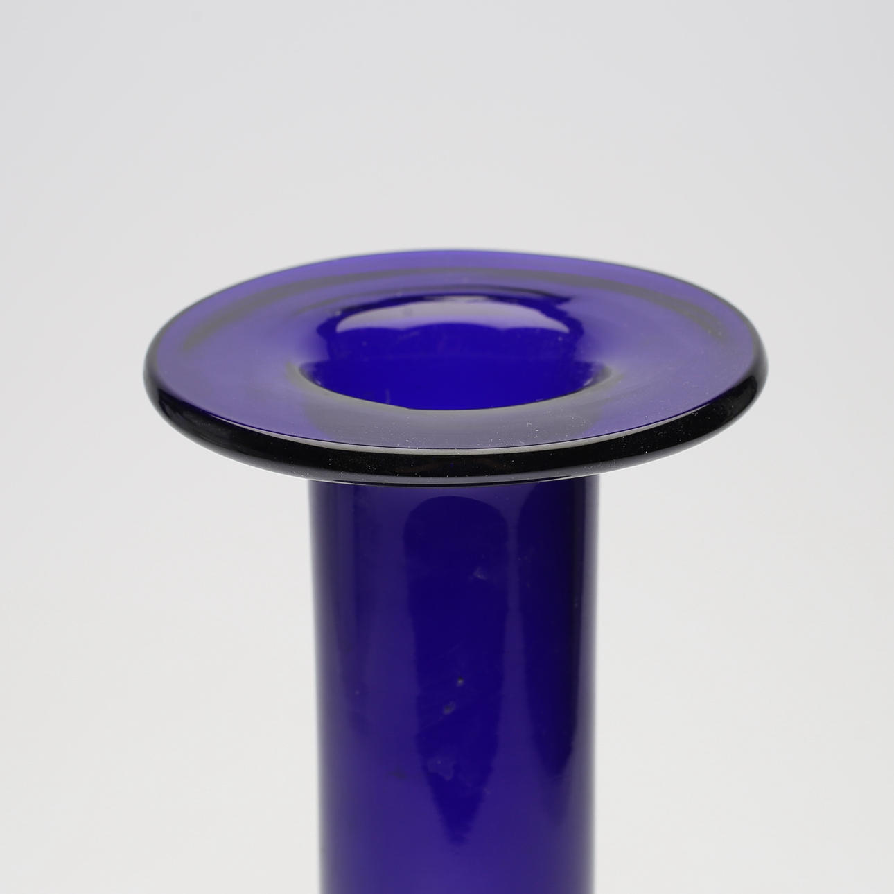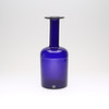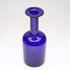 Blått glas. Märkt med etikett. Höjd ca 38 cm.