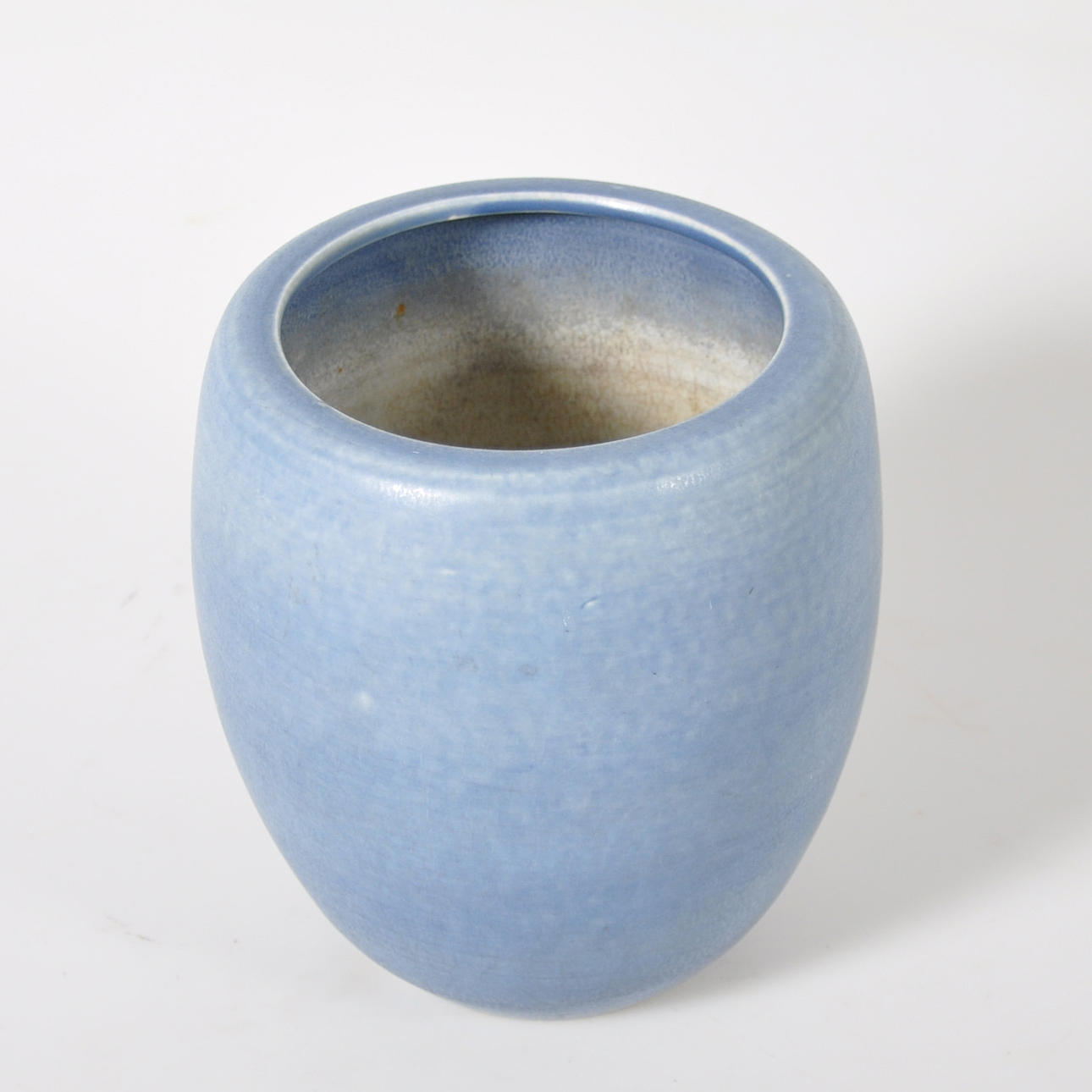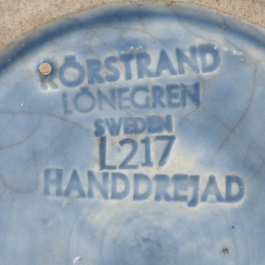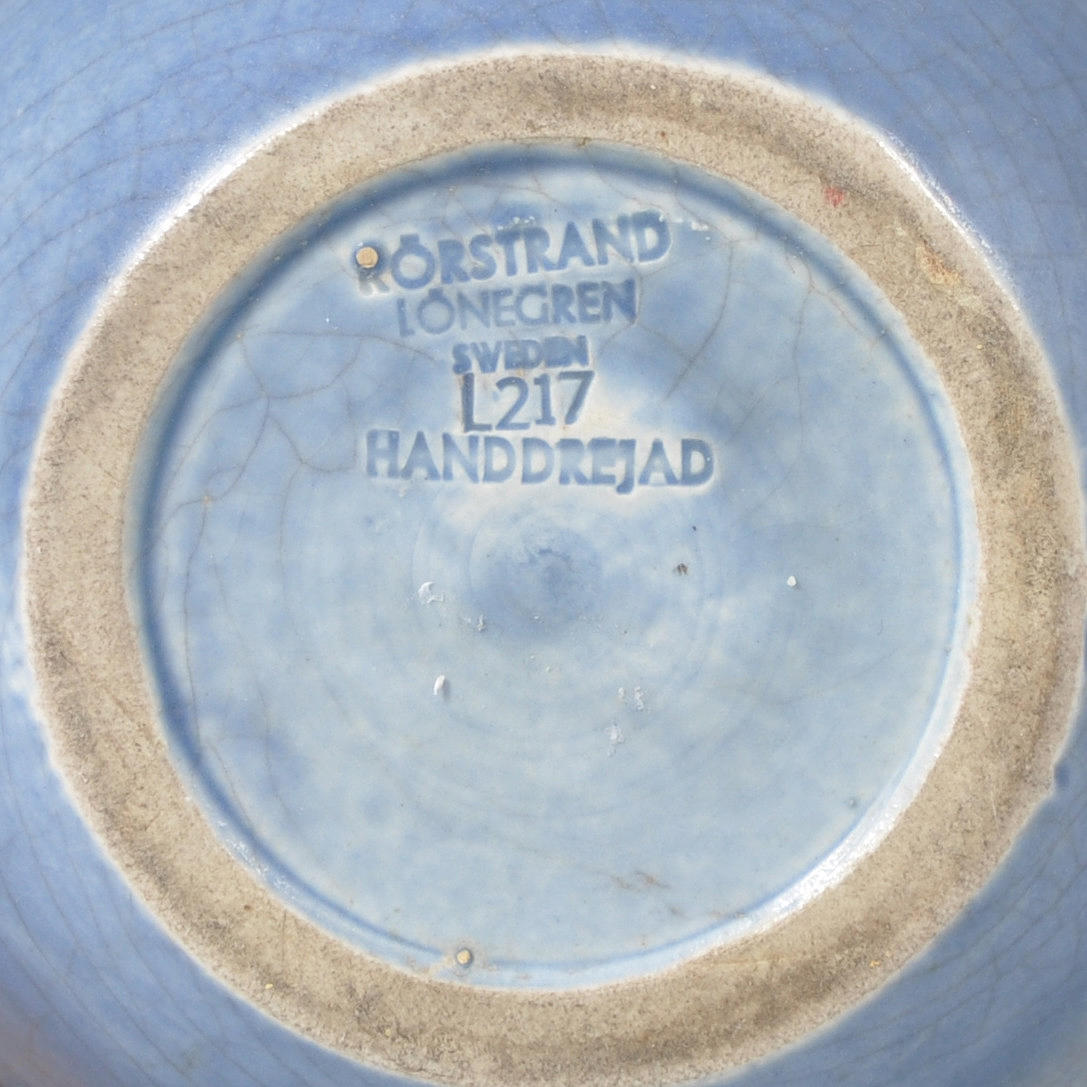 Blå glasyr. Stämplad RÖRSTRAND LÖNEGREN SWEDEN L217 HANDDREJAD. Höjd 16 cm.