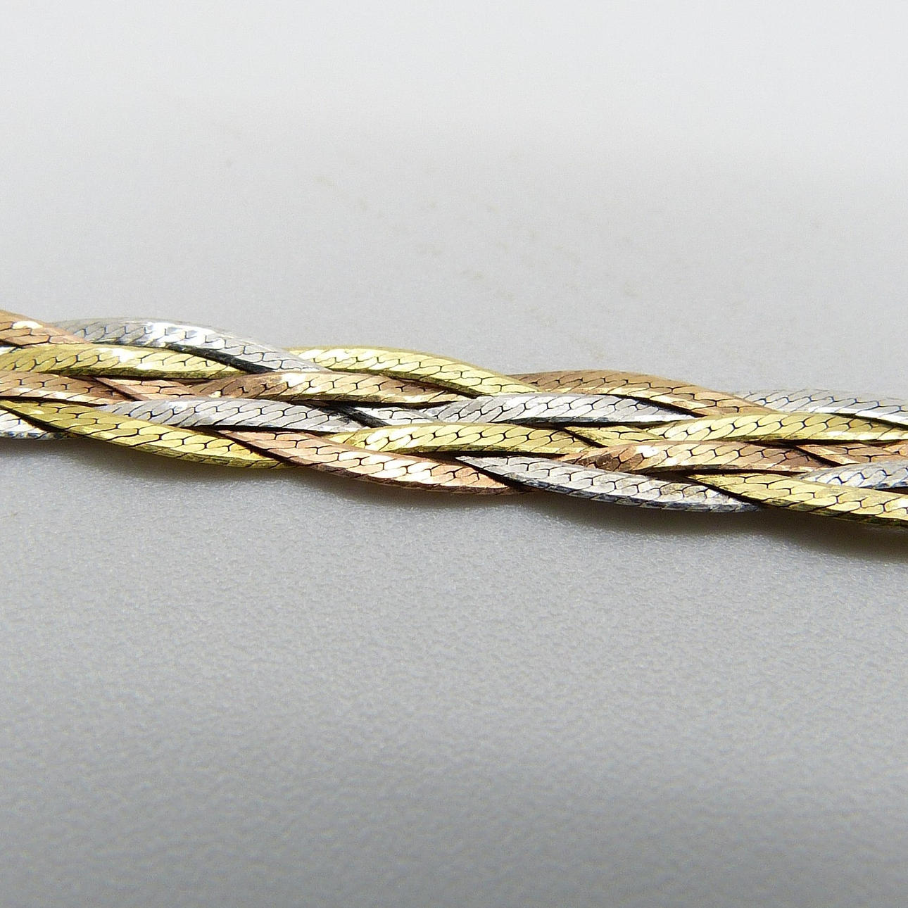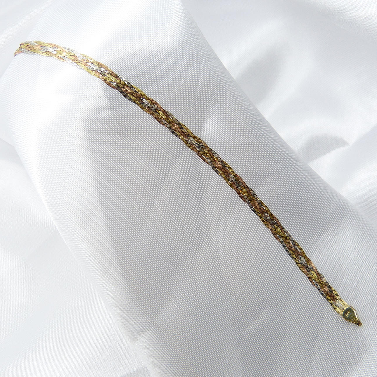 Detta trefärgade guldarmband har sammanflätade länkar och mäter 18 cm lång, ca.