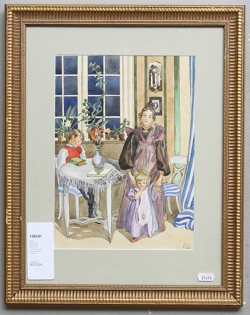 136161. CARL LARSSON. Kopia efter. Karin och barnen. Akvarell. Monogramsignerad A.W.
