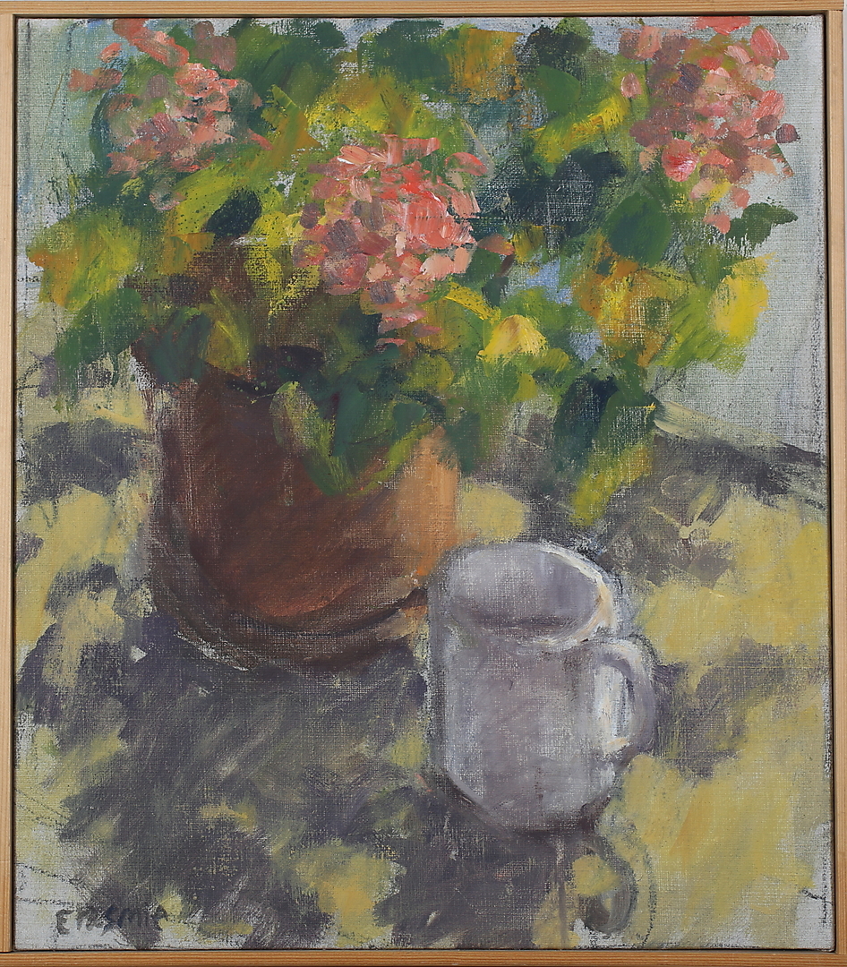 136179. TORSTEN ERASMIE. Stilleben med pelargoner med vitt mugg.