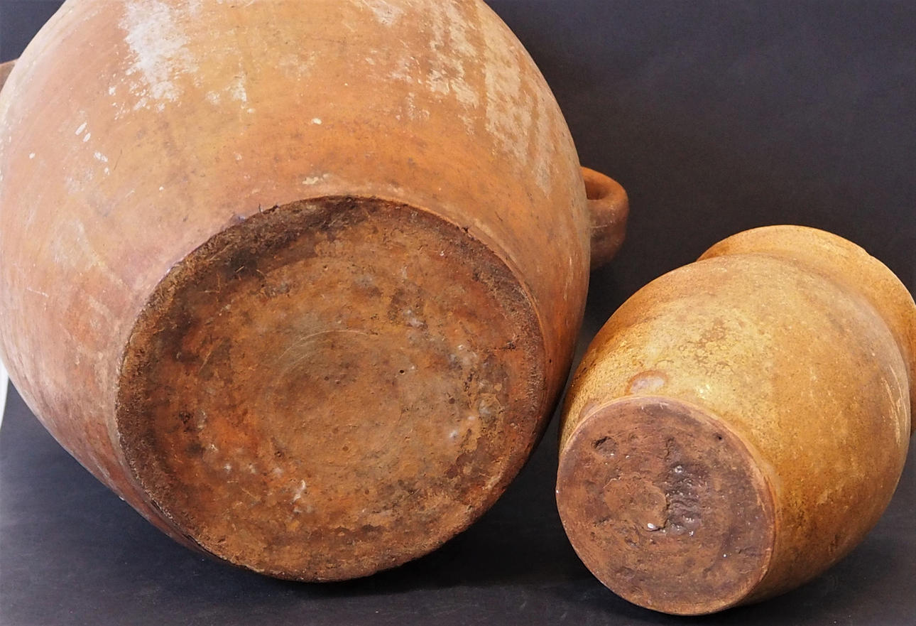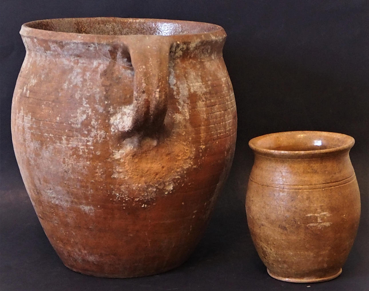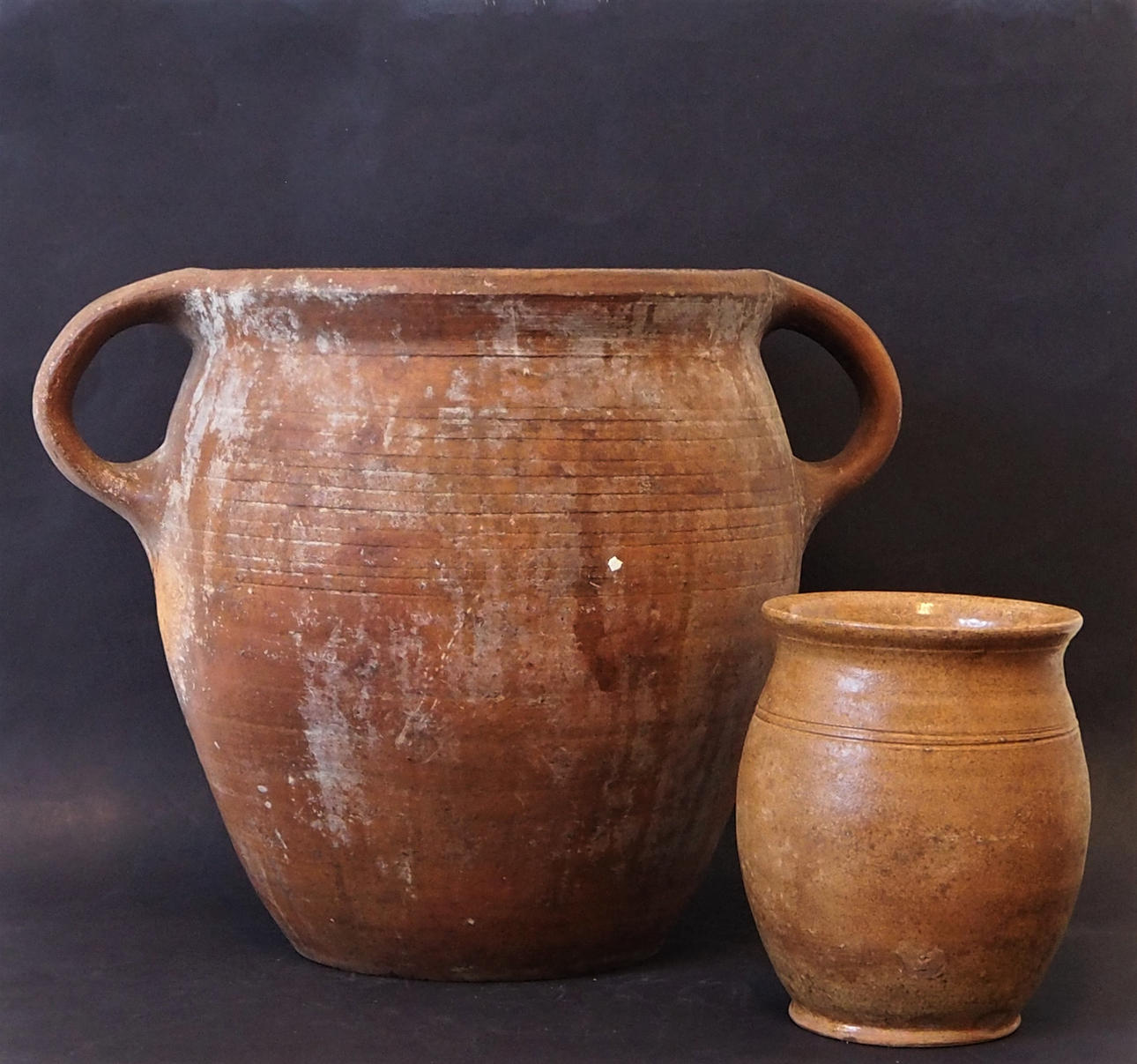 Höjd 25,5 cm, diameter överkant 21 cm. Lilla kruset, höjd 14 cm, diameter överkant ca 11 cm.