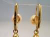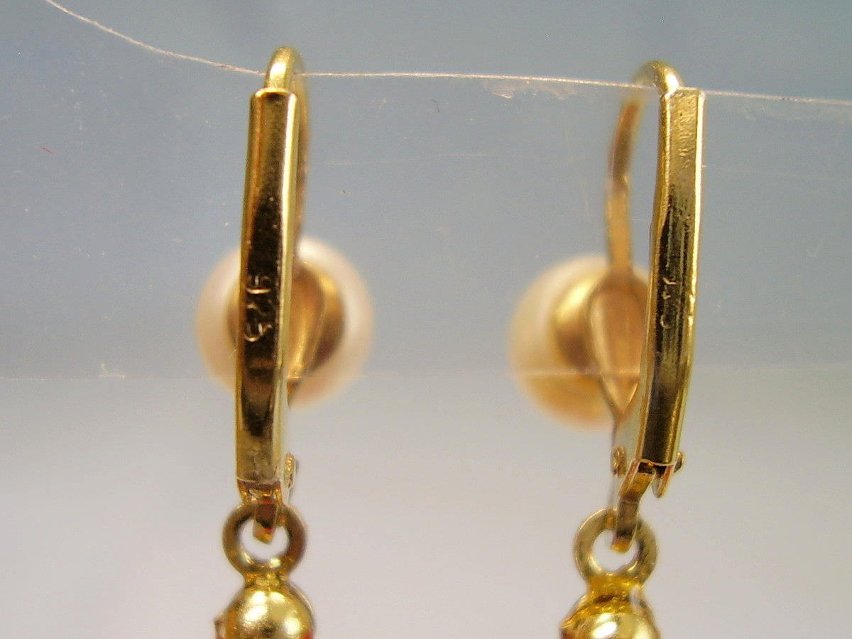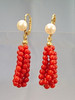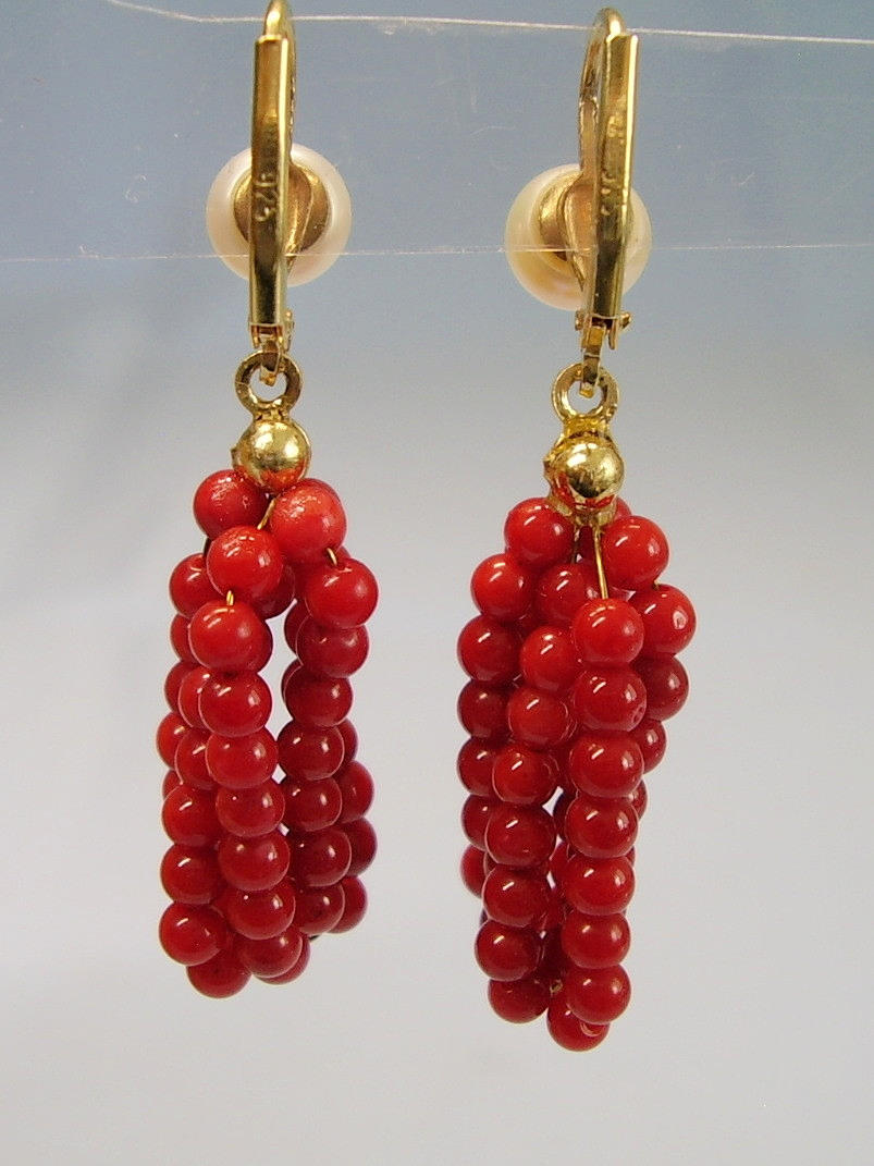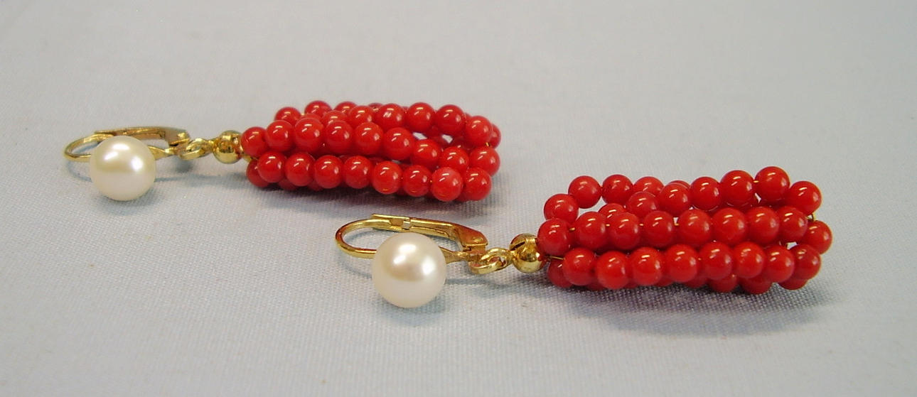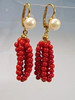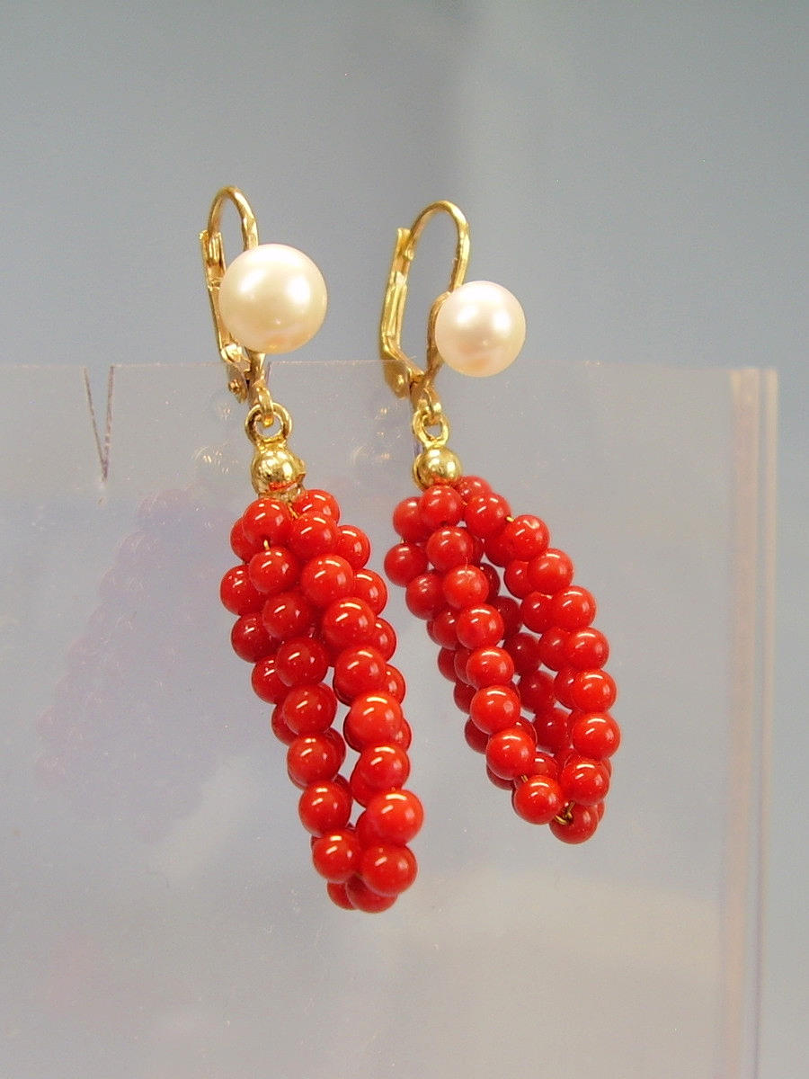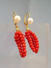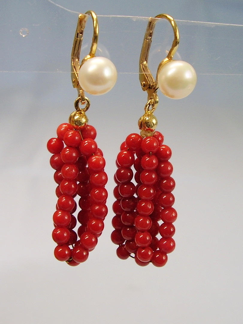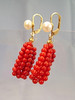 De har gångjärn öronkrokar som är prydda med äkta, vita odlade pärlor i en fin glans och underbar glans. Under hänger mullbär gjorda av sex strängar av finpolerade röda korallpärlor i en mycket vackert bevarad glans.