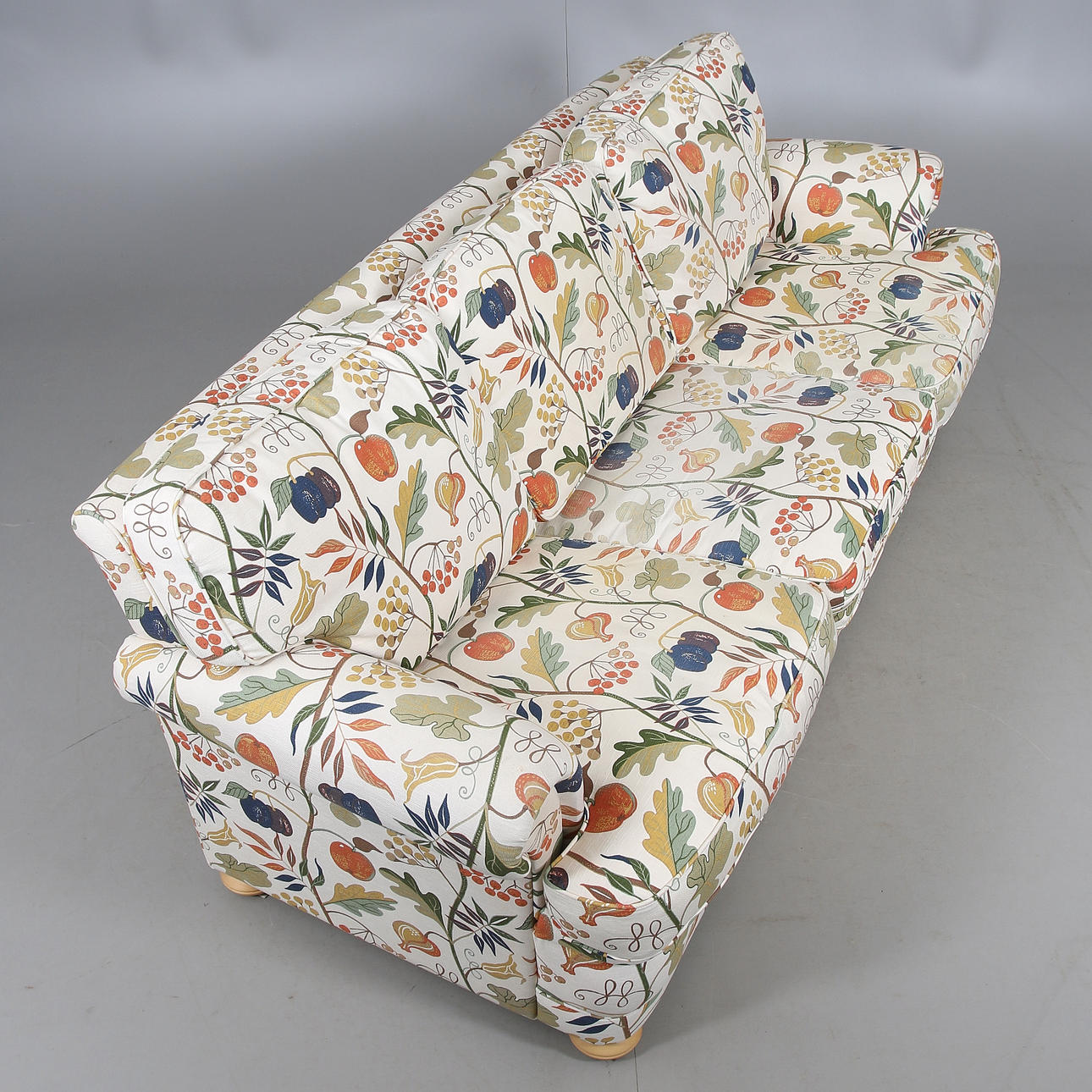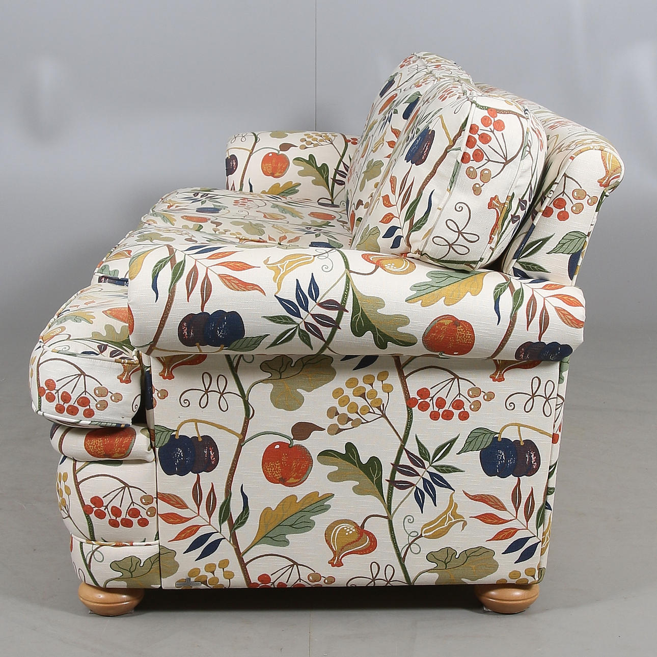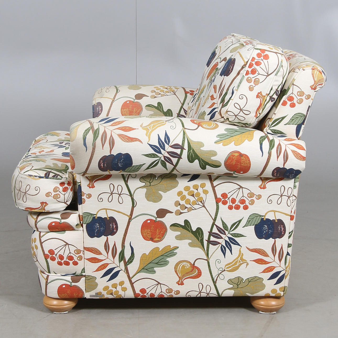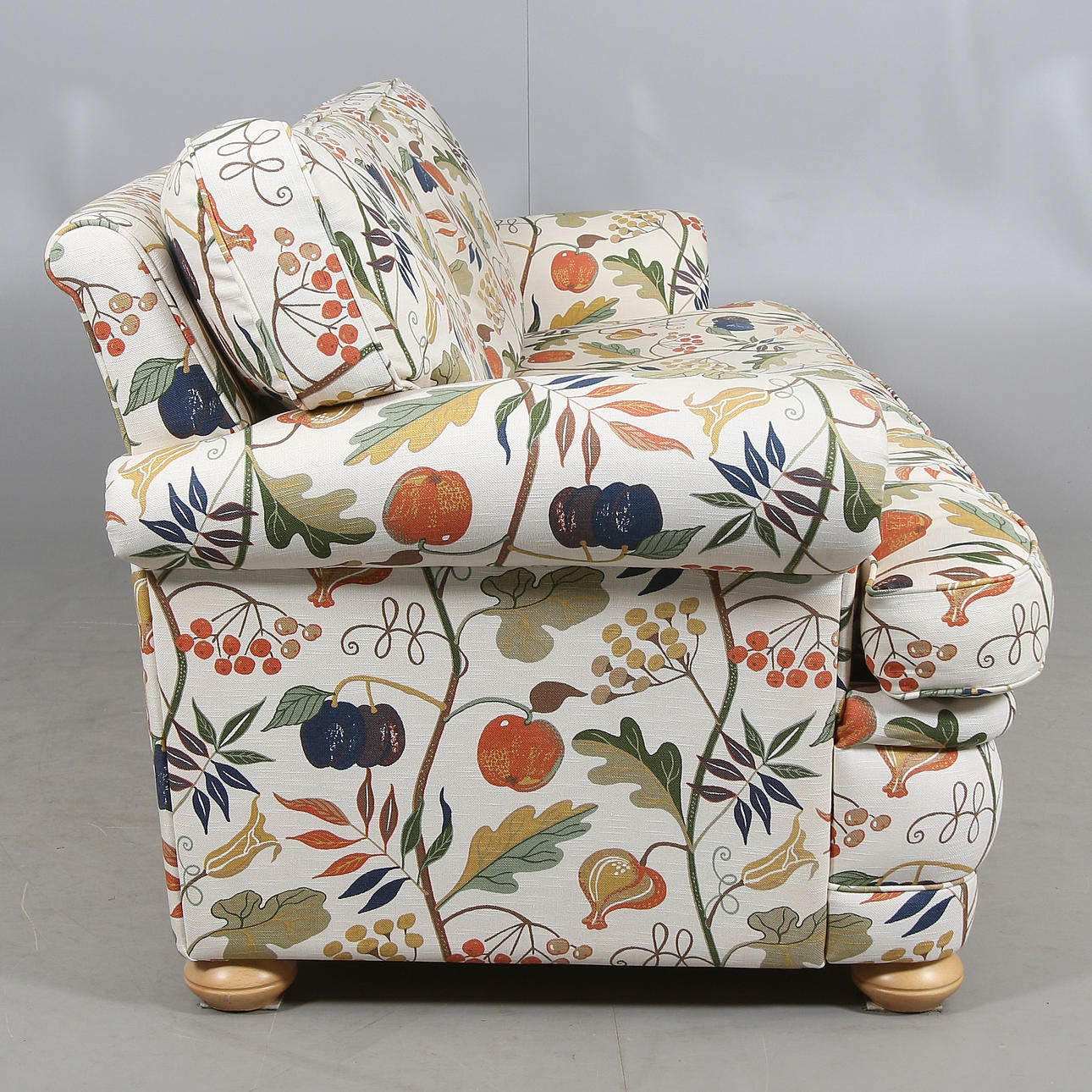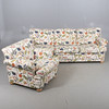 Med lösa plymåer av textil med floralt mönster. Soffa, längd 216 cm. Fåtölj, rygghöjd 88, sitthöjd ca 48 cm.