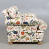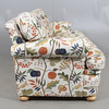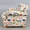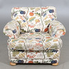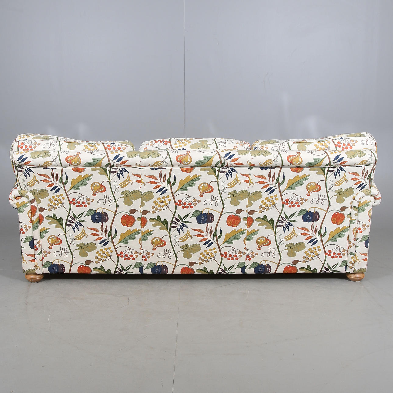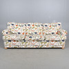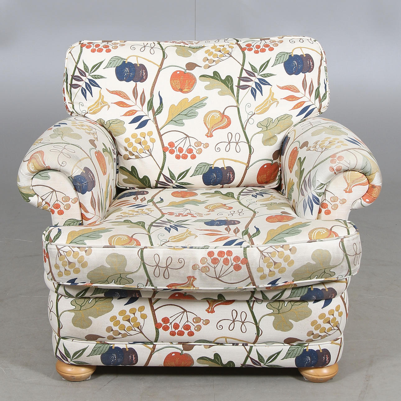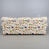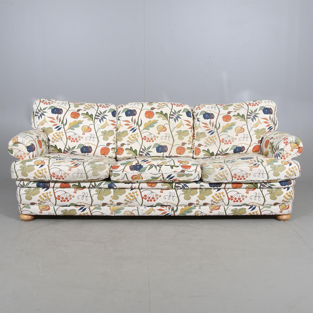 Med lösa plymåer av textil med floralt mönster. Soffa, längd 216 cm. Fåtölj, rygghöjd 88, sitthöjd ca 48 cm.