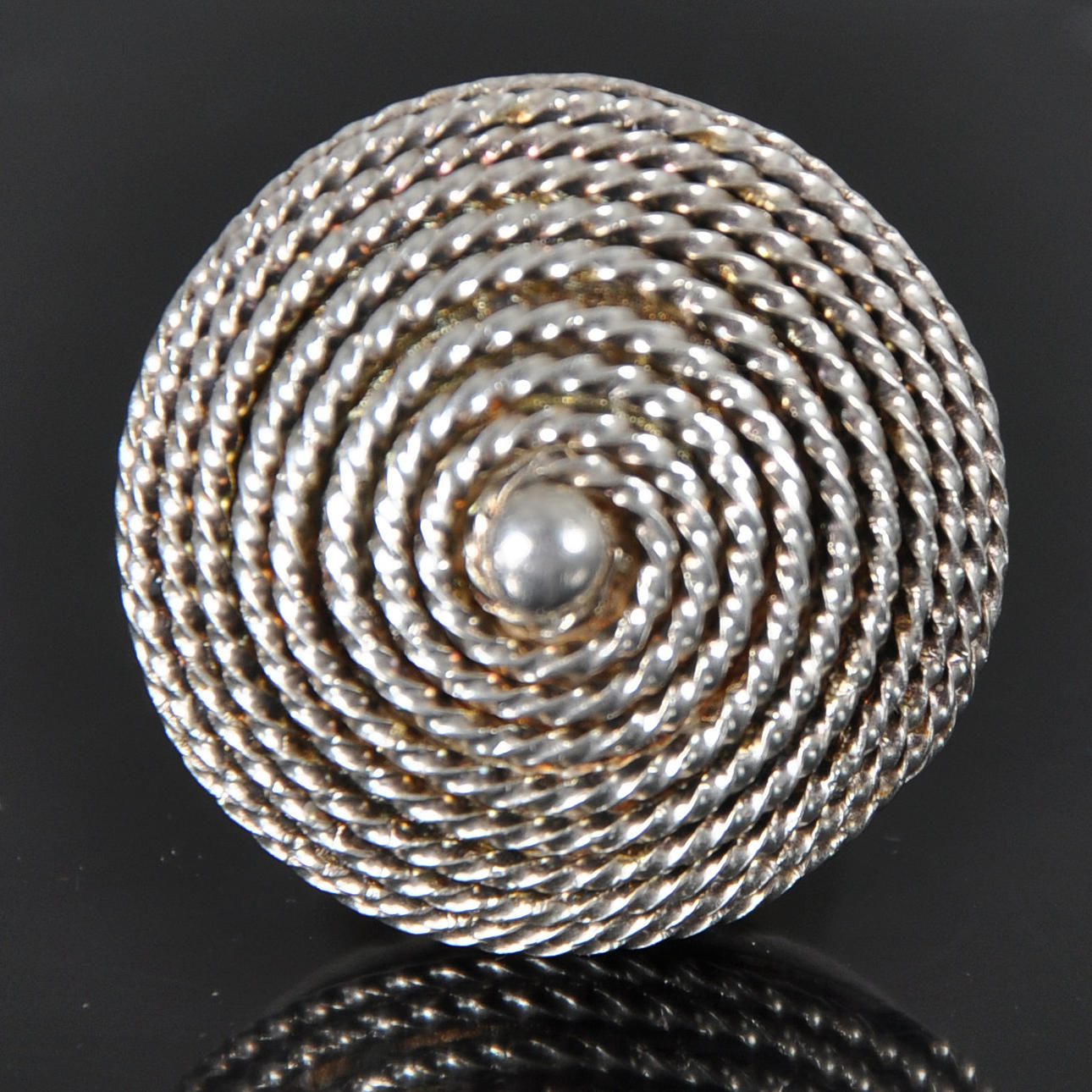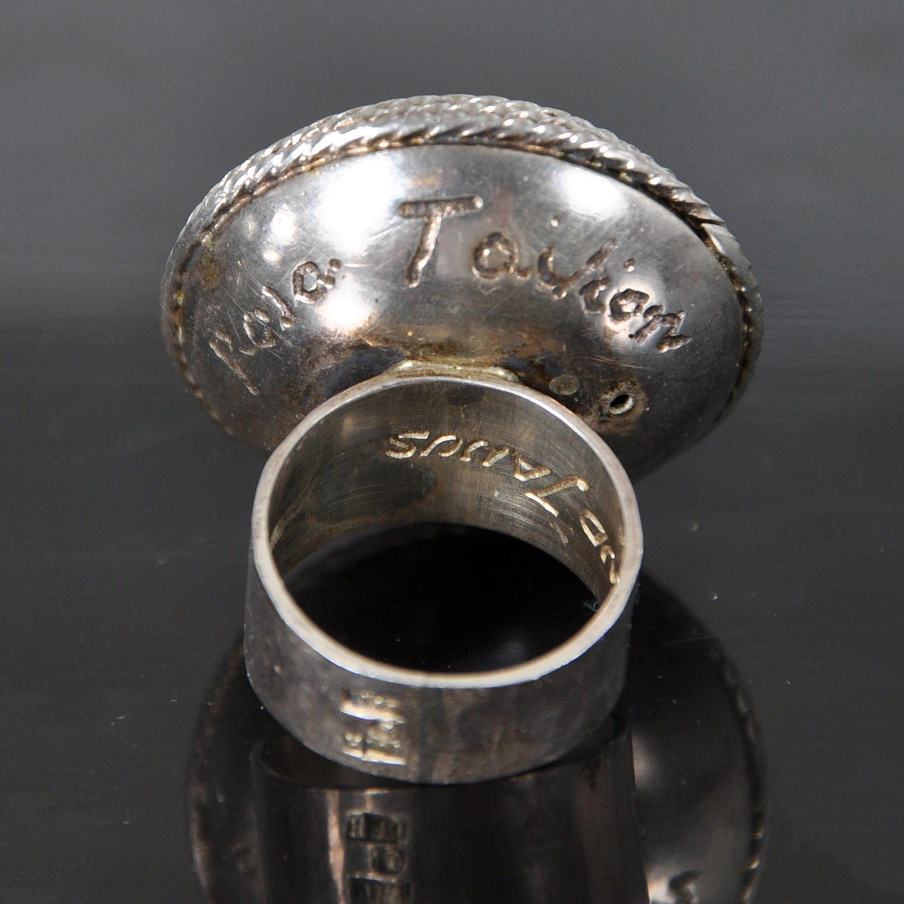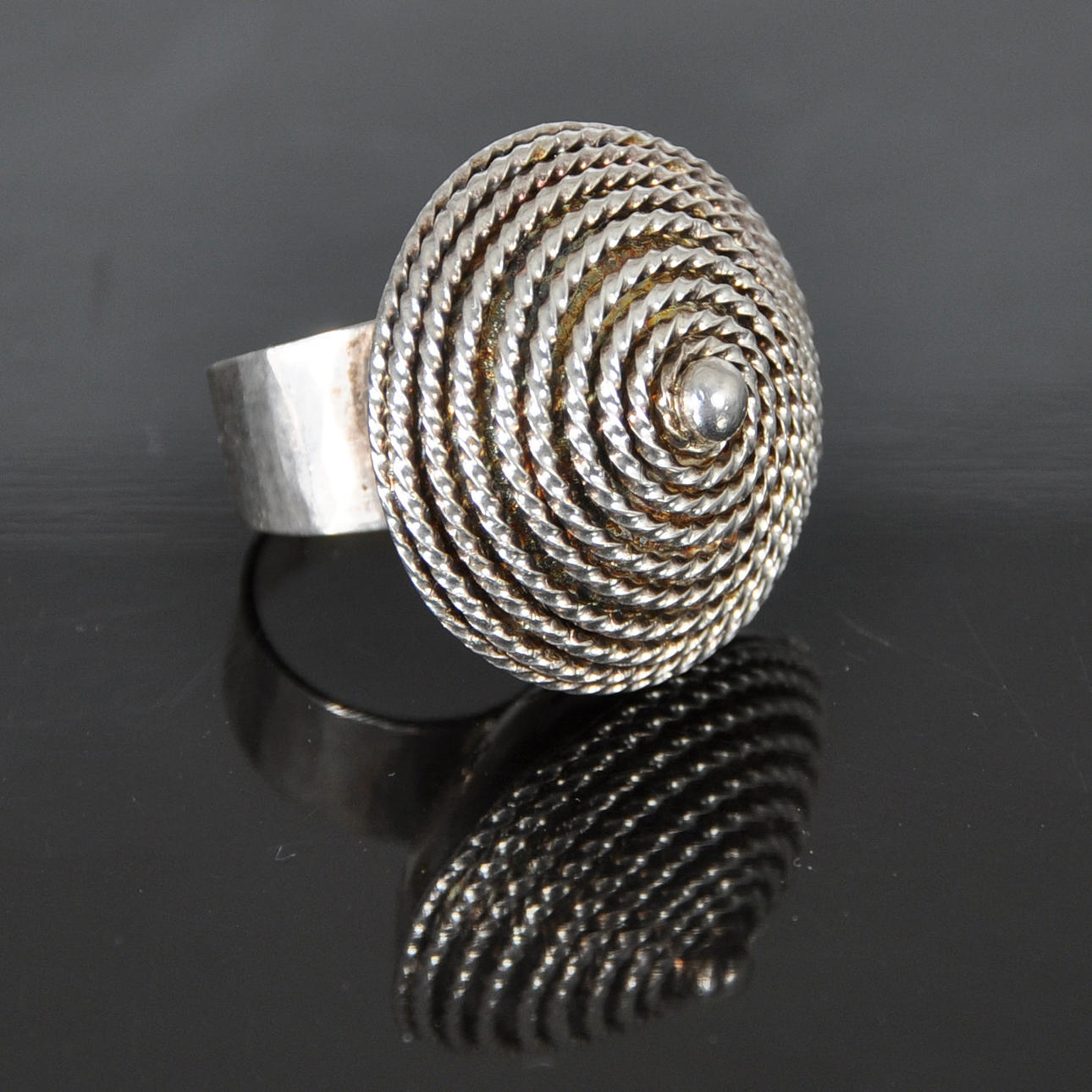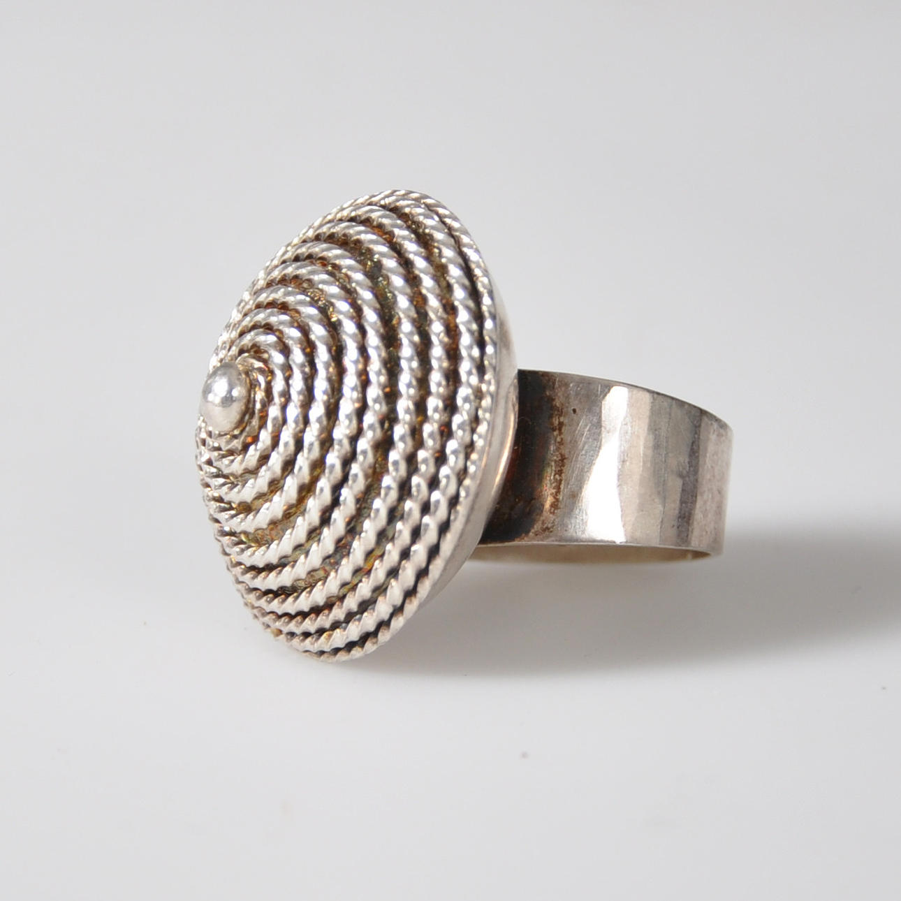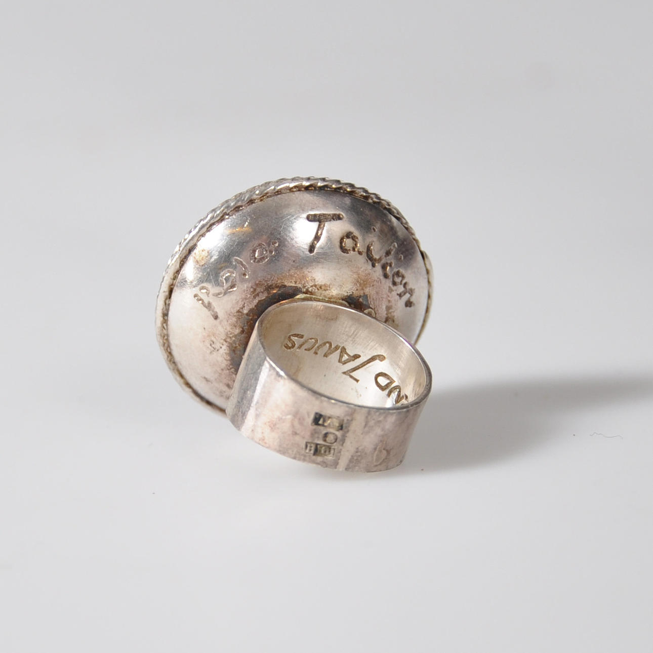 Ring av silver med runt, toppigt framstycke med spiraldekor. Bred, slät skena, framstycke i form av avskuren sfärisk form krönt med toppigt tak som är täckt med spiralmönster, granulering och mitt i en slät silverkula. Gravyr på framstyckets undersida: "Rosa Taikon". skenan märkt BERND JANUSCH