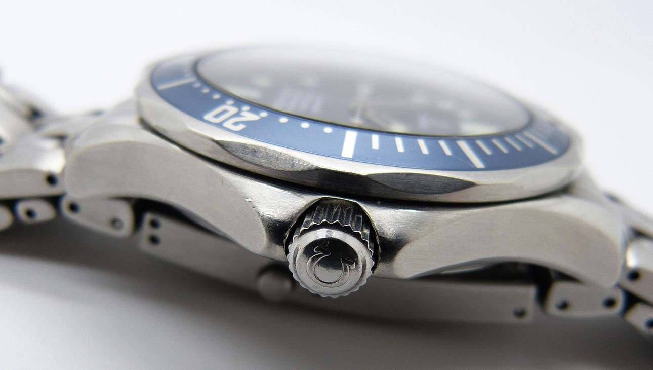 Denna Omega dykarklocka är schweizisk tillverkad med en mekanisk (automatisk) rörelse och har lysande, glöd-i-mörkret batonger och händer.