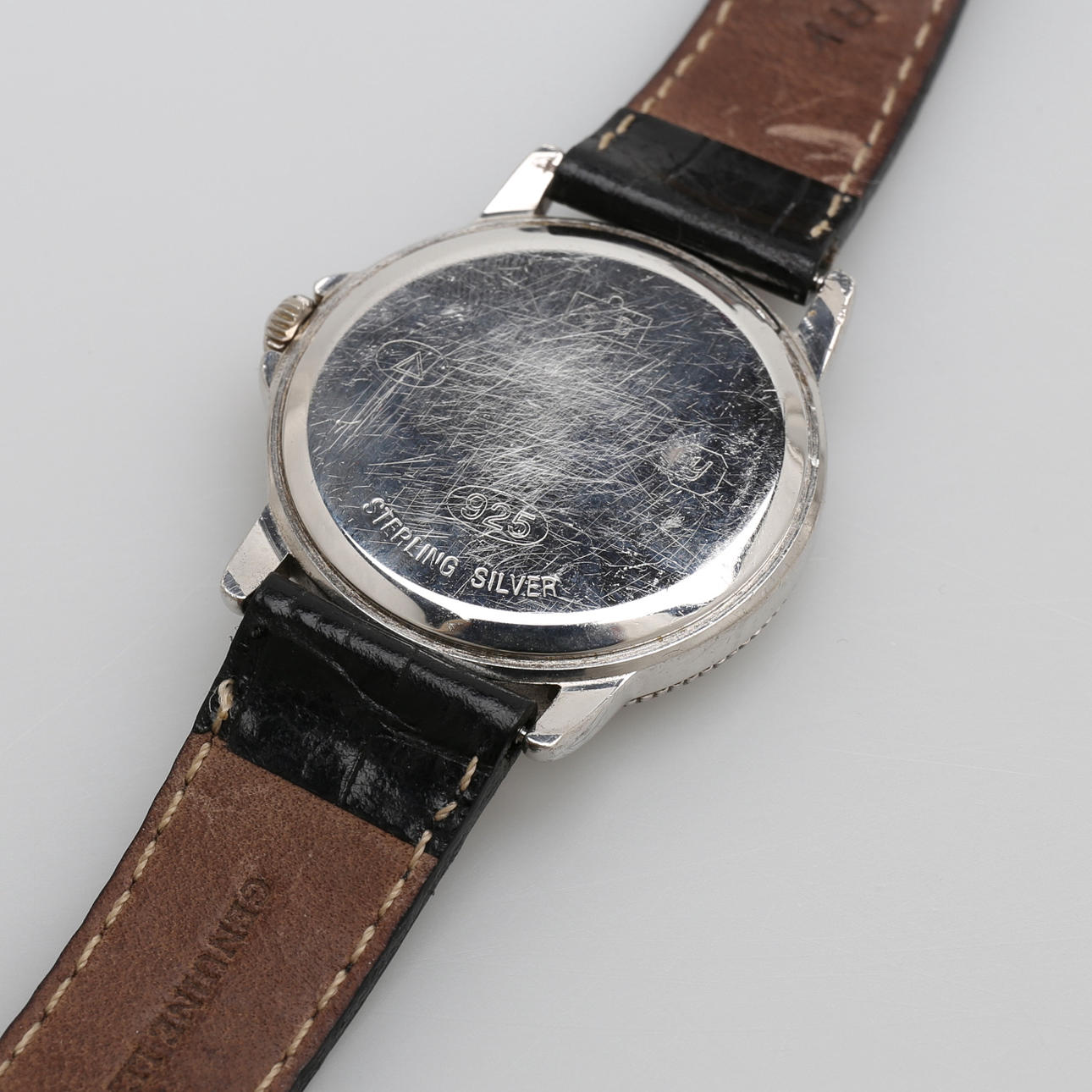 Sterlingsilver, med safirglas och originalarmband av läder och originalsölja, diameter 33 cm, box och certifikat.