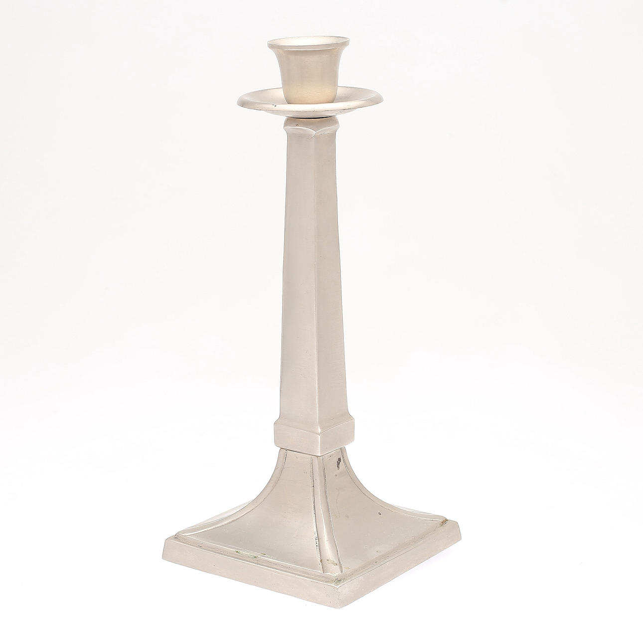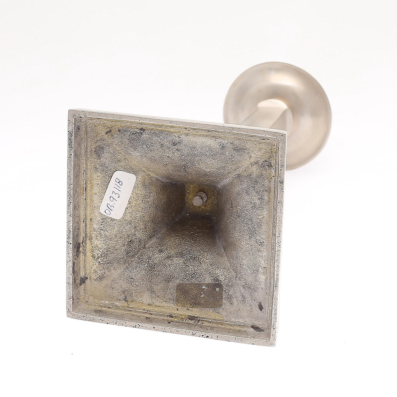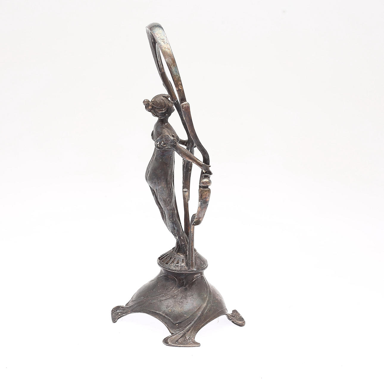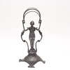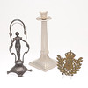 Ställ, troligen för smycke, jugend, höjd 24 cm. Ljusstake, höjd 27 cm. Märke, höjd 11 cm.