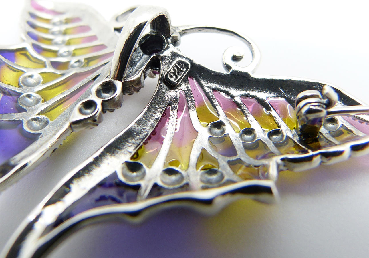 • Inläggningar med emalj i färgerna lila, gult och rosa