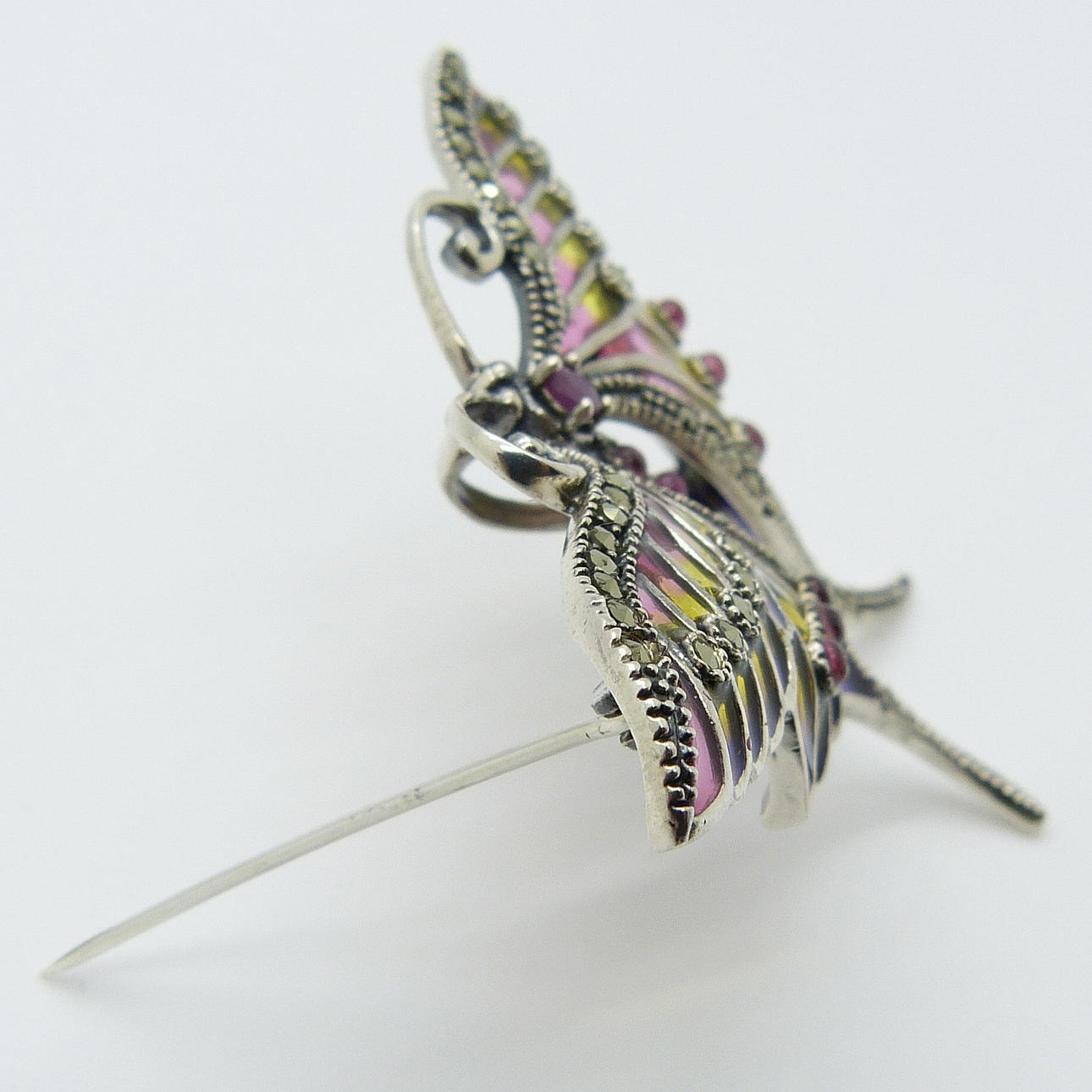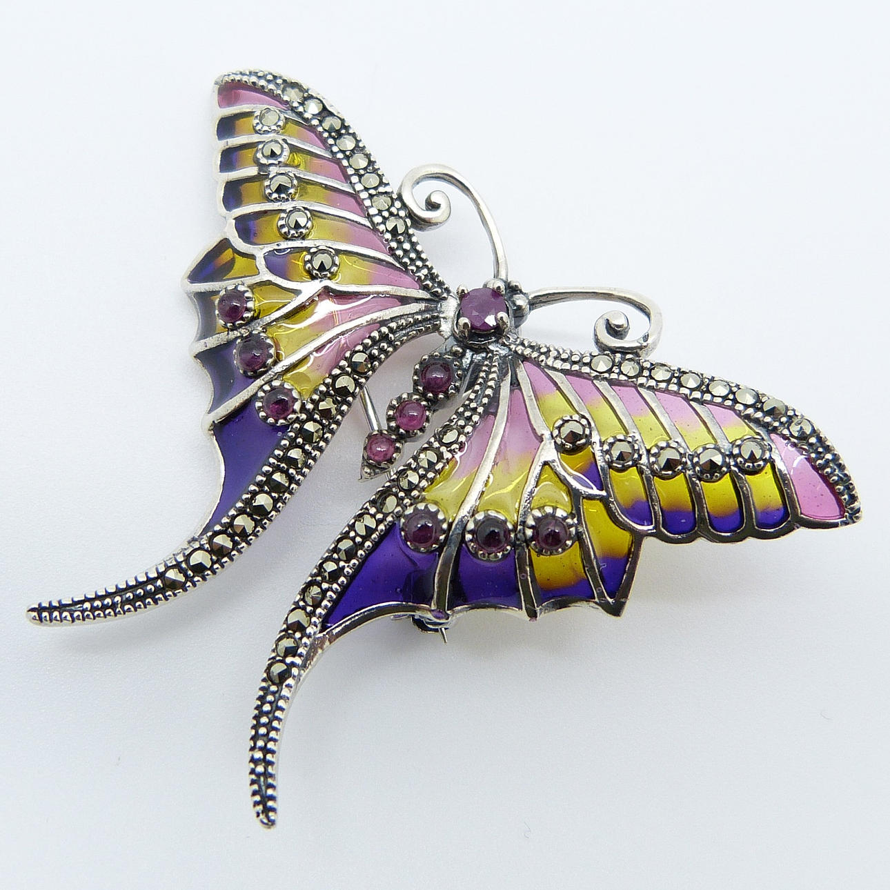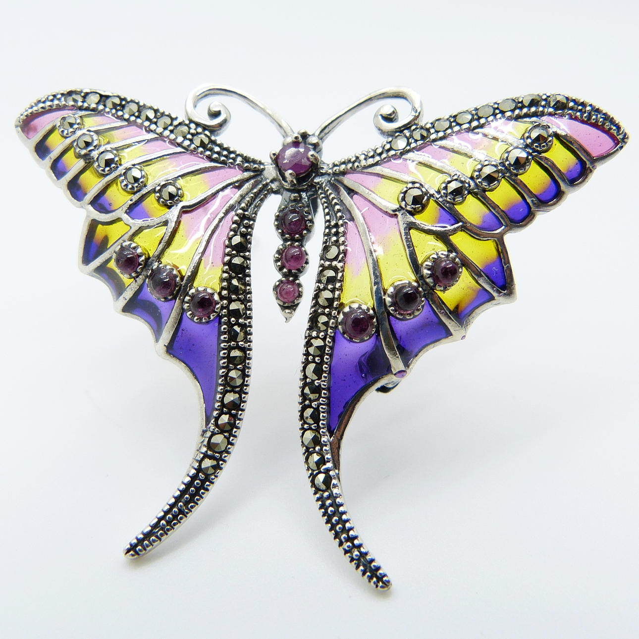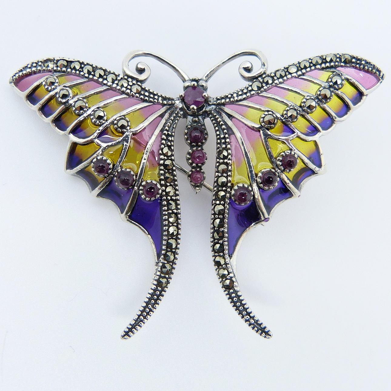 Stor malbrosch/hänge kombinerad med rubiner och markasit och inläggningar med färgad emalj.
