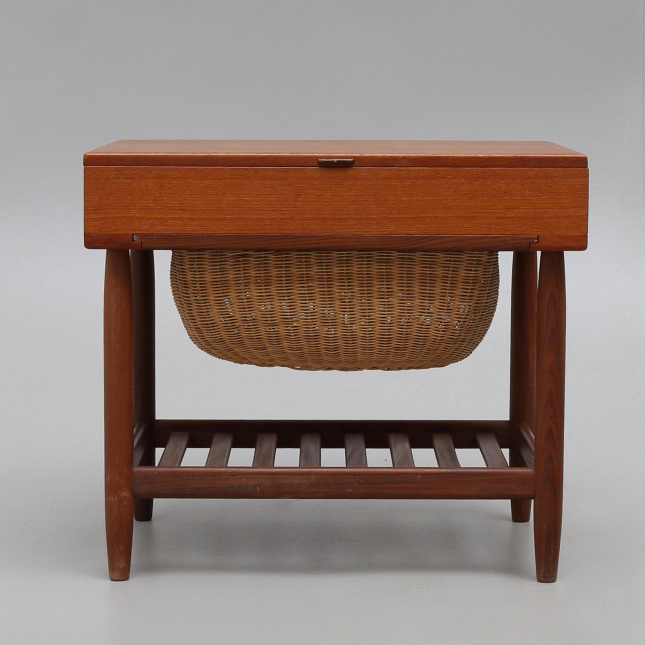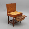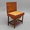 Uppfällbar skiva med inredning med fack, undertill utdragbar korg samt hylla. Teak.m flera träslag. Märkning saknas. Höjd 52, bredd 60, djup 40 cm.