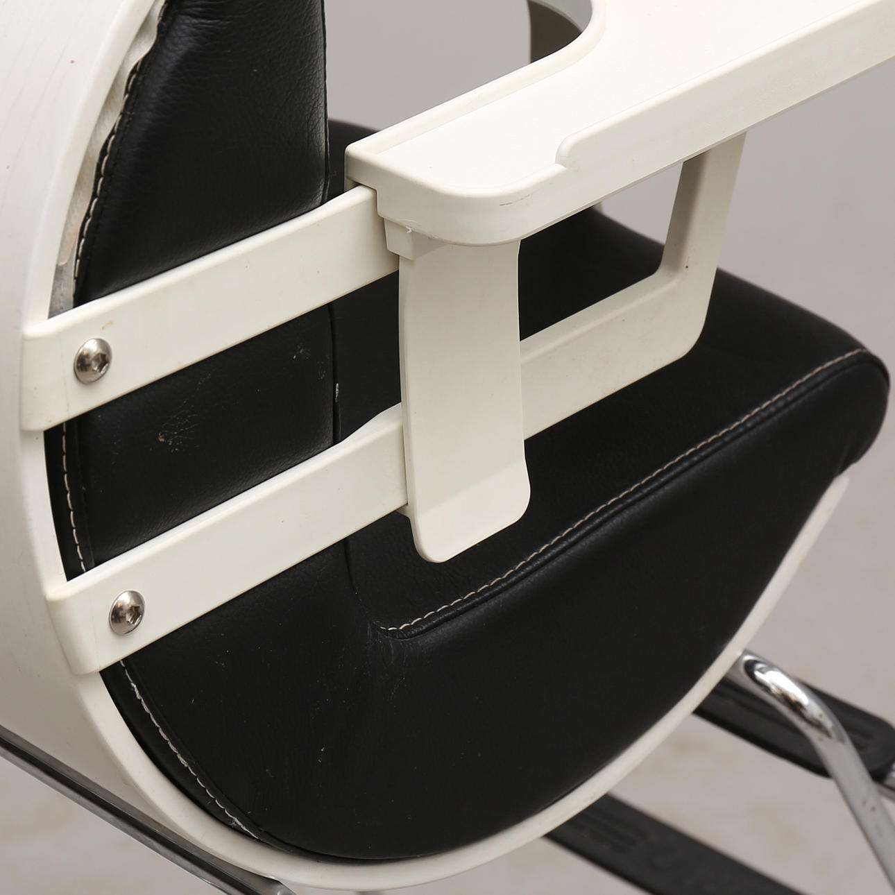 Plast/Polyester Med bygel och bricka. Höjd 84 cm. Bredd 46,5 cm. Djup ca 56 cm.