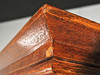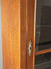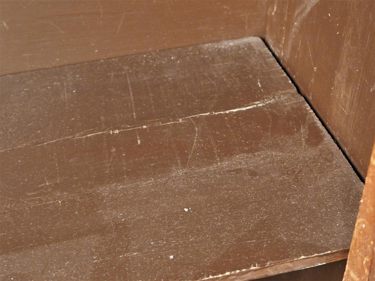 Dörr skev, spricka vänster sida längst upp på skåpet.Lås fungerar men låsbleck saknas på skåp.