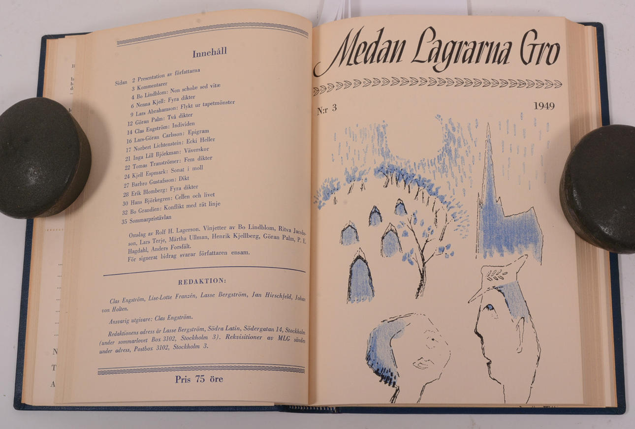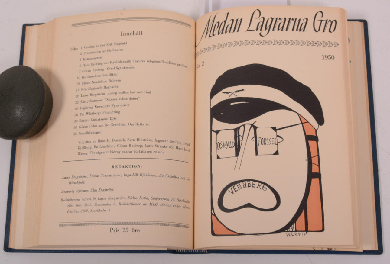 " Skönlitterära bidrag av Lasse Berström, Hans Björkegren, Jörn Donner, Clas Engström, Ing-Marie Eriksson, Kjell Espmark, Bo Grandien, Sven Lindqvist, Göran Palm, Urban Torhamn, Tomas Tranströmer, Beppe Wolgers, Per Wästberg mfl. Unglitterär tidskrift utgiven av en grupp Stockholmsgymnasister. ".