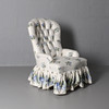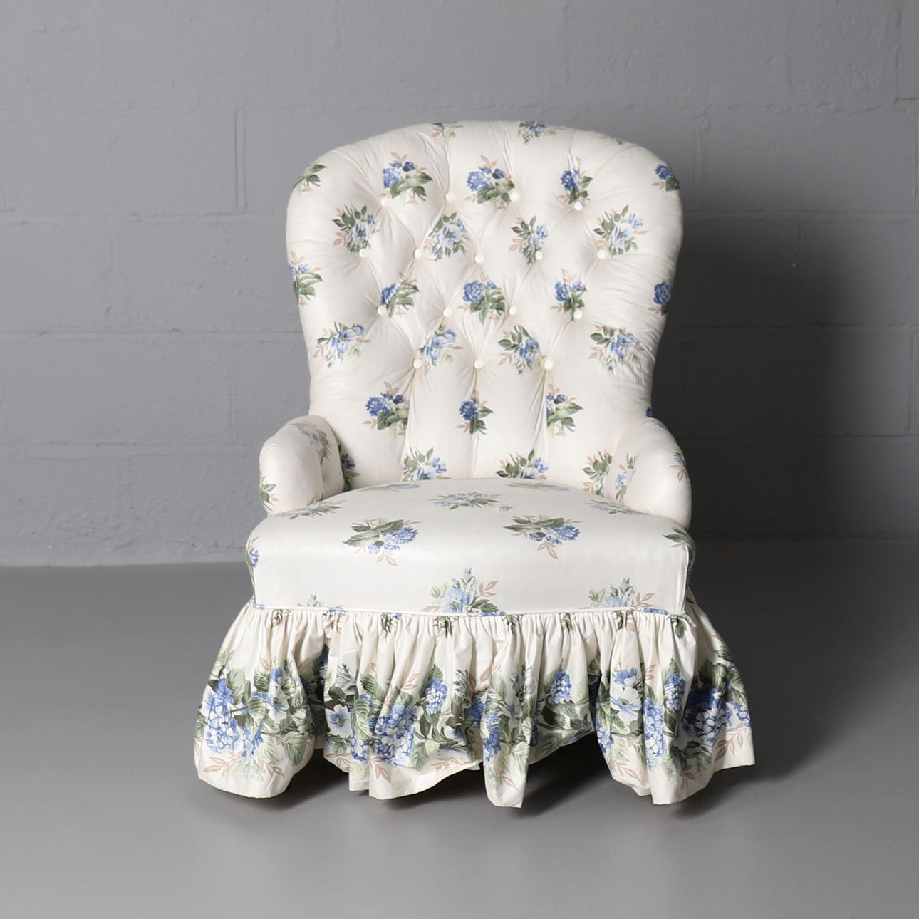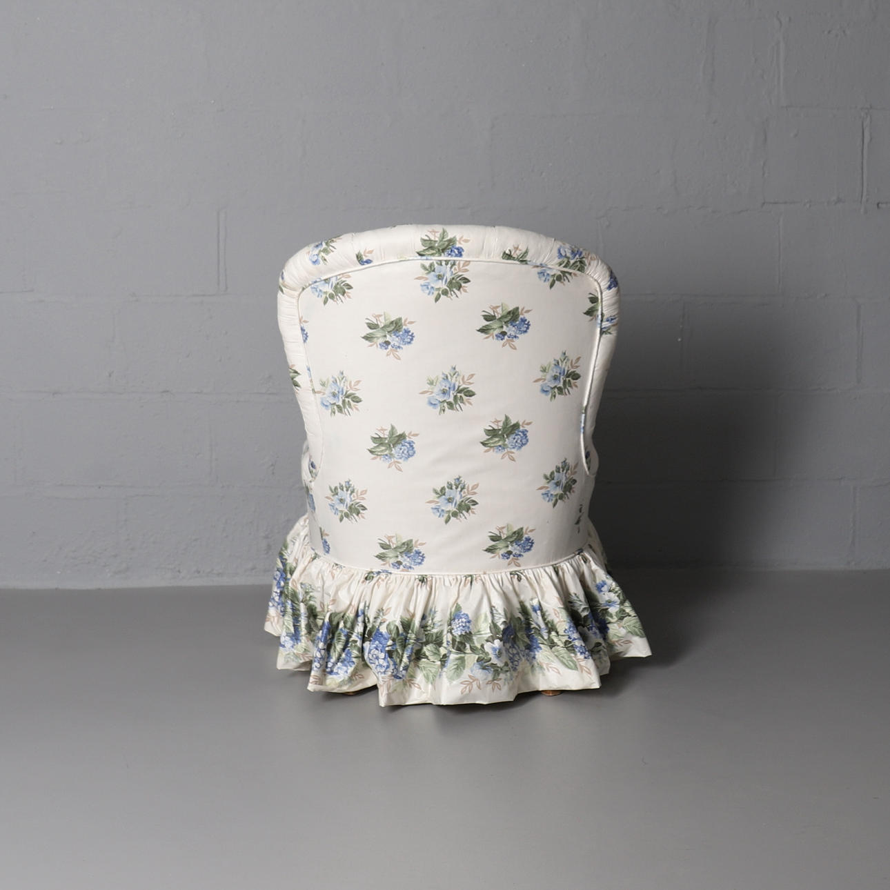 andra hälften av 1900-talet, sked tillbaka med korta rullarmar, på serpentin framsäte, och vände frambenen, klädd i en glaserad blommig bomullschintz, med veckad valance,