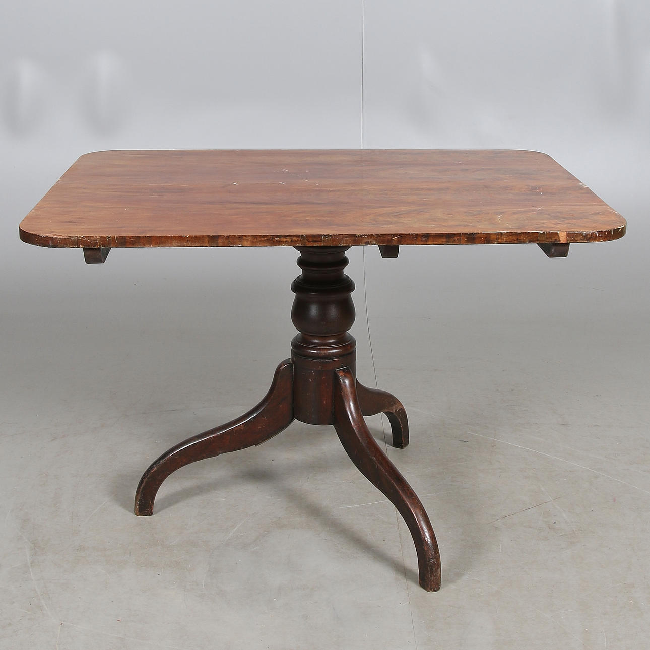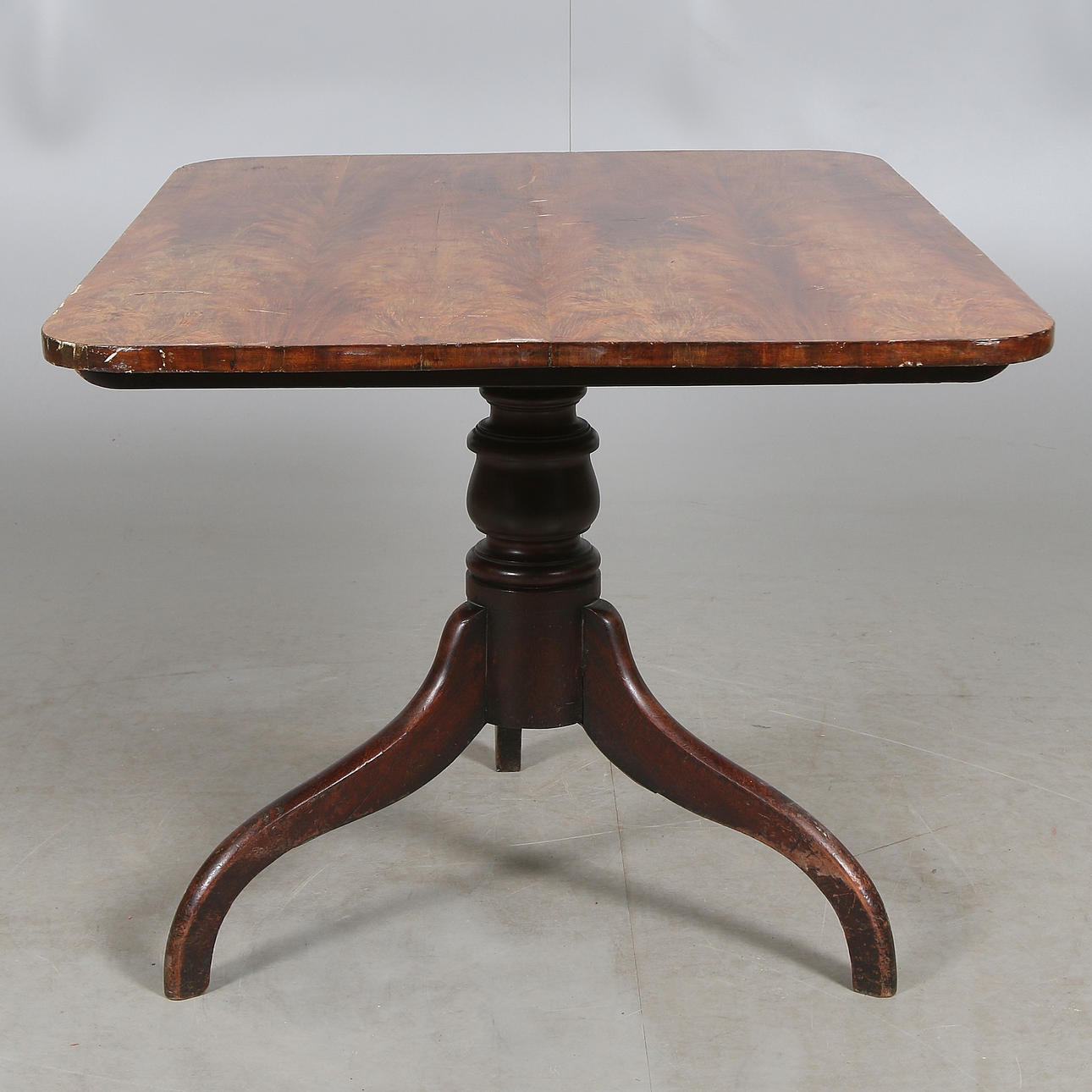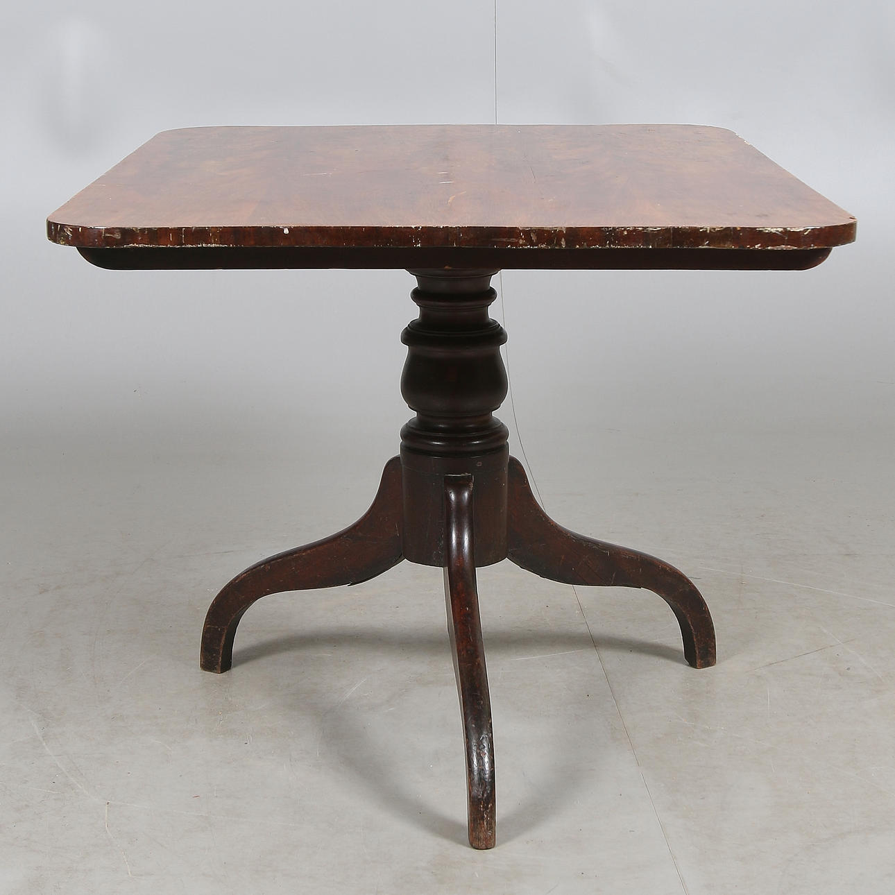 Balustersvarvad fot. Bordsskiva fanérad i mahogny. Längd ca. 107, bredd 82, höjd 71/134 cm.