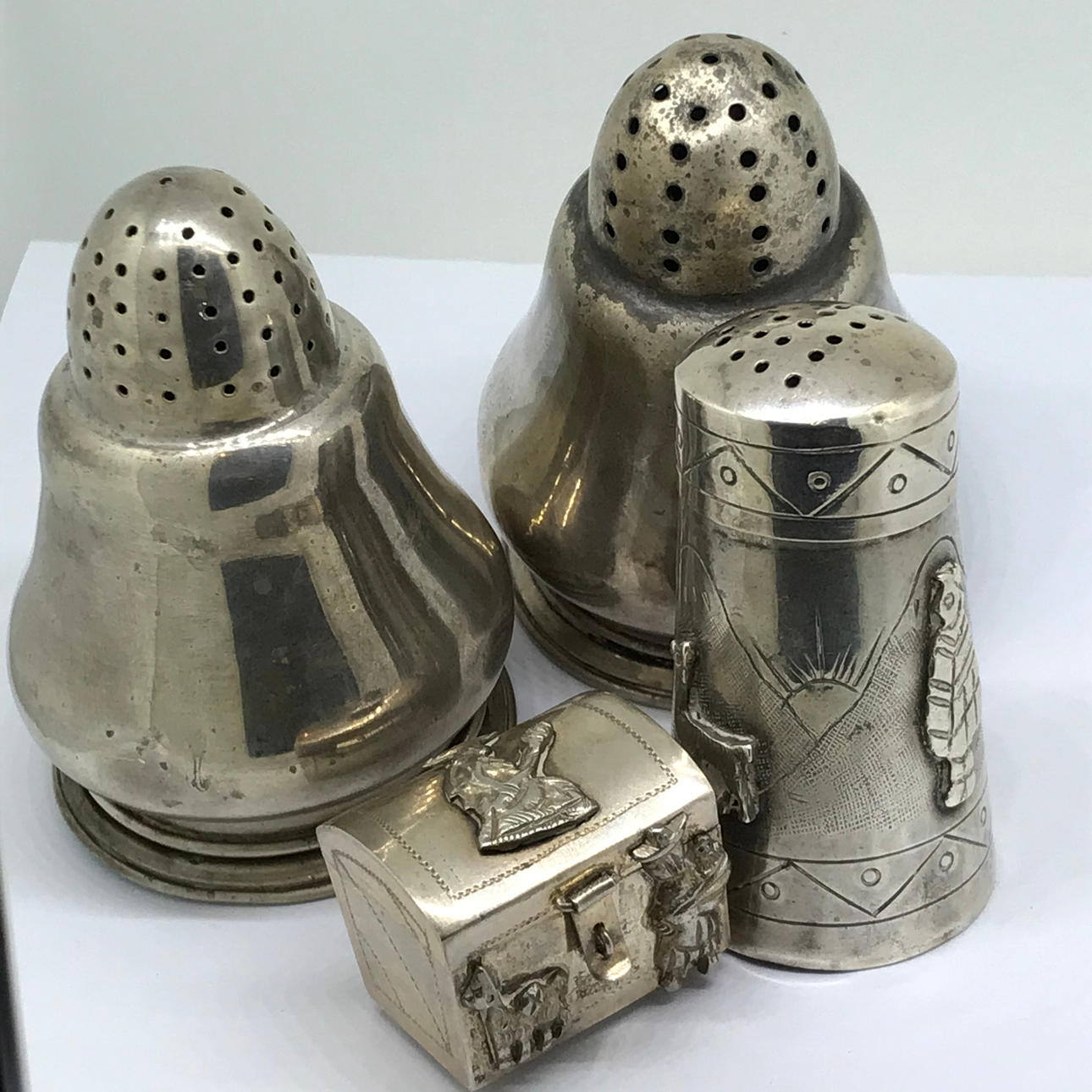 1. BALUSTERSKAKARE, ett par, silver. Peruanska. Båda pepparskakarna är silver (stämplade ”925"). De är märkta med orden ”INDUSTRIA PERUANA PLATA ESTERLINA 925 CAMUSSO”.