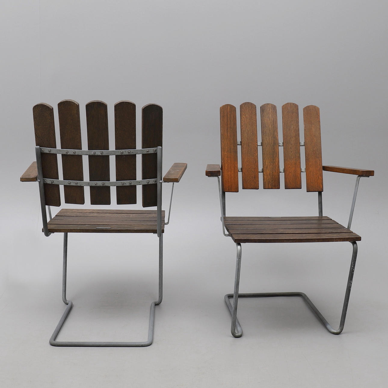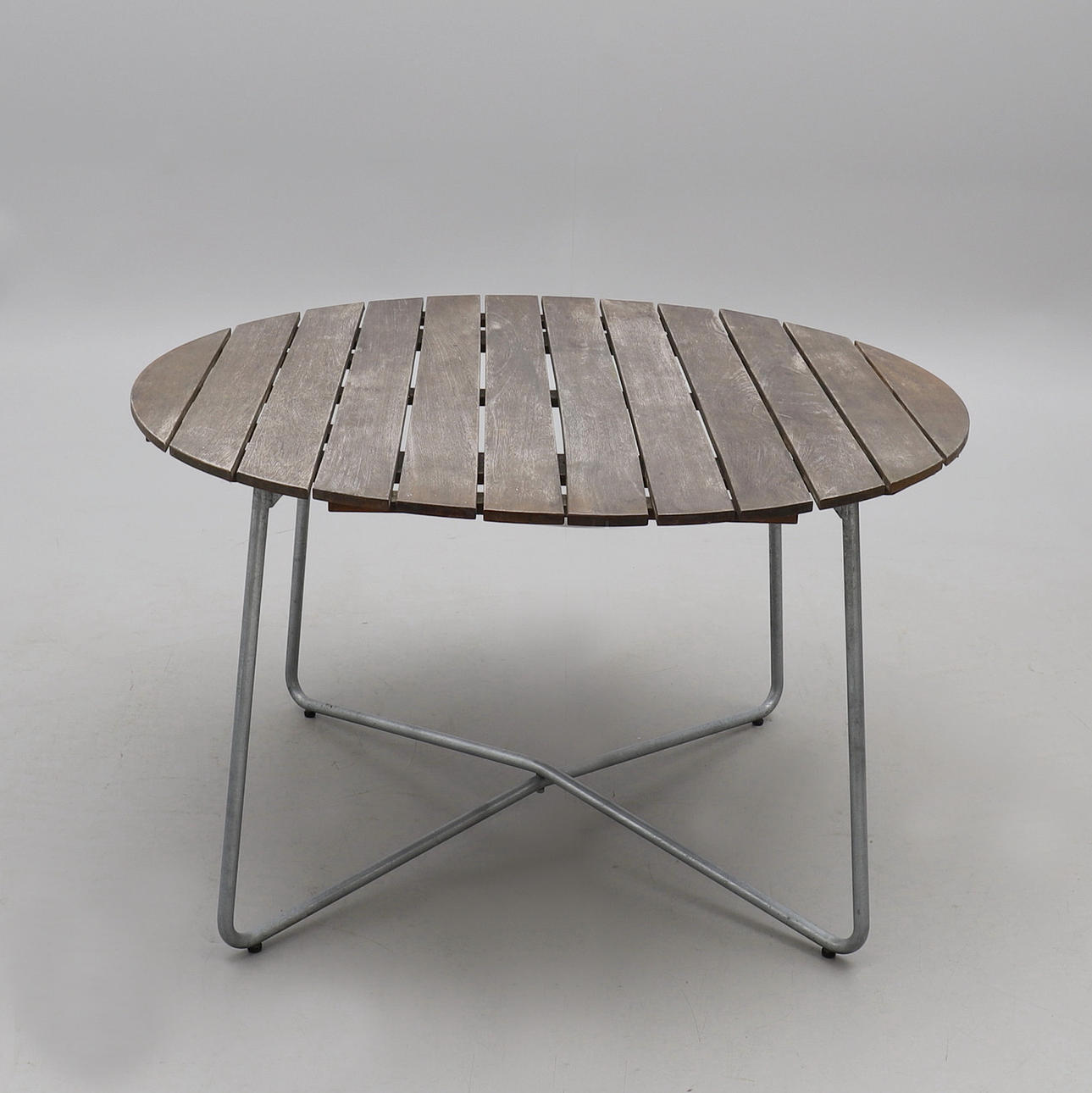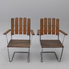 1 Runt bord "9A 120" och 4 fåtöljer "A2", oljad ek med varmförsinkat stativ. Plakettmärkt. Diameter 120, höjd 72 cm.