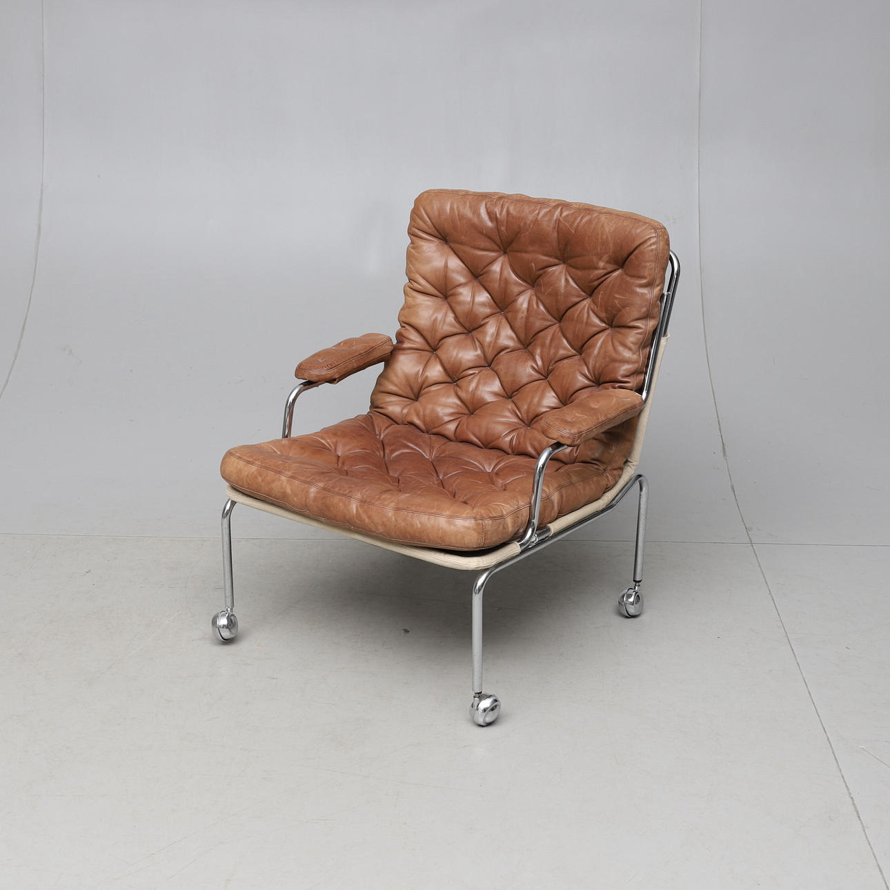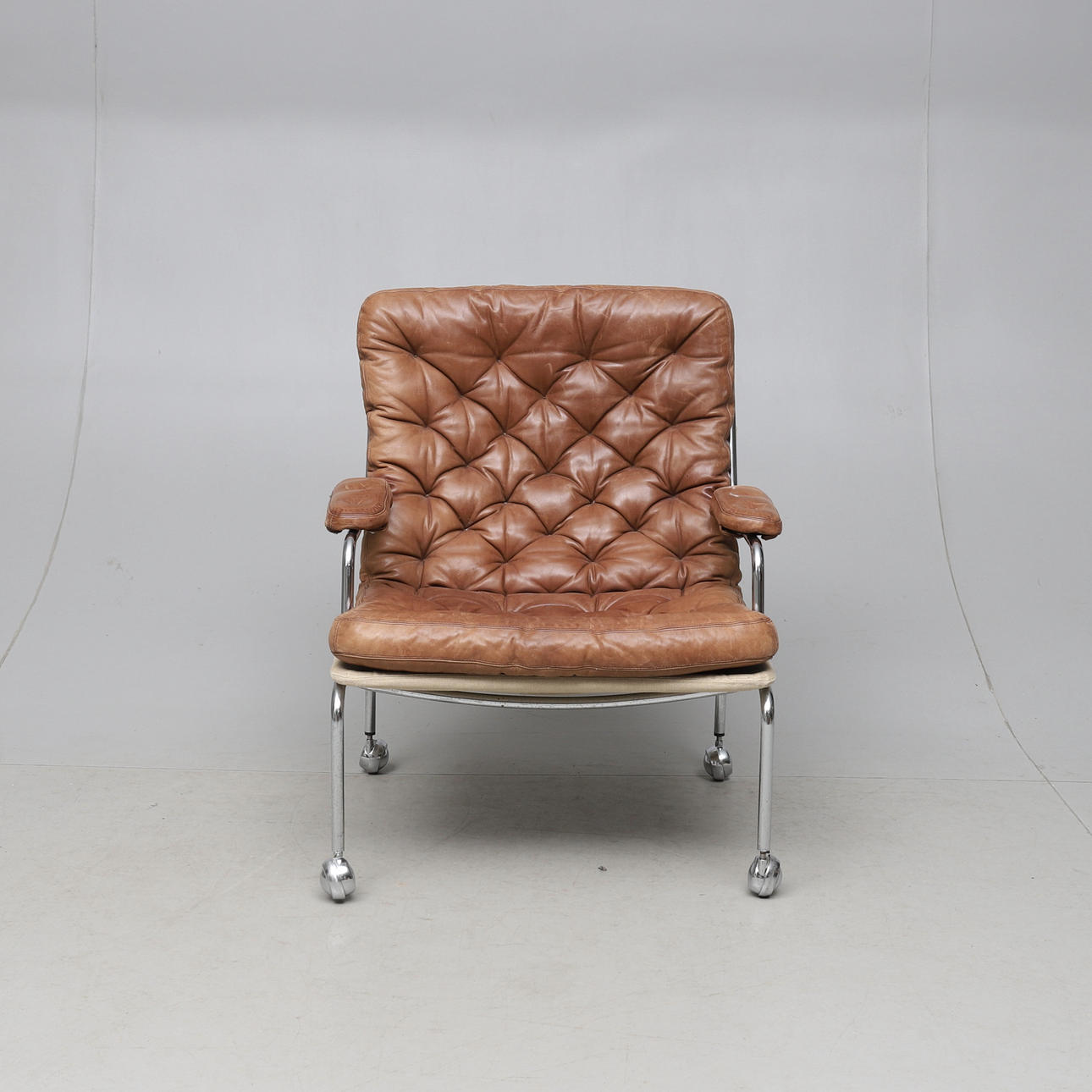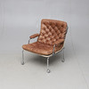 Brunt skinn. Total längd ca 110 cm. Två armlän. Ett underrede medföljer, ej Bruno Mathsson.