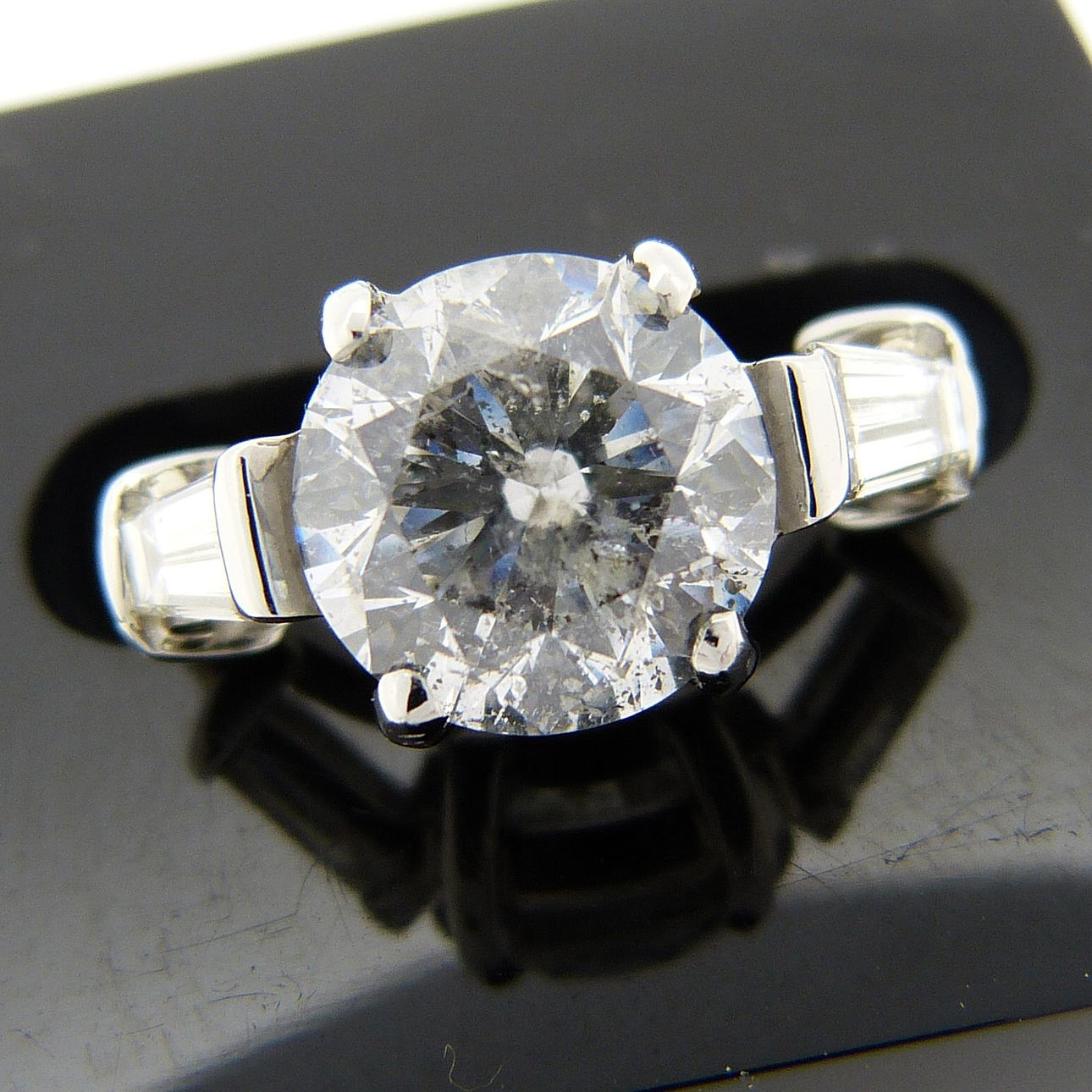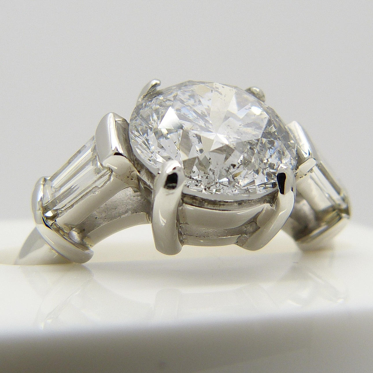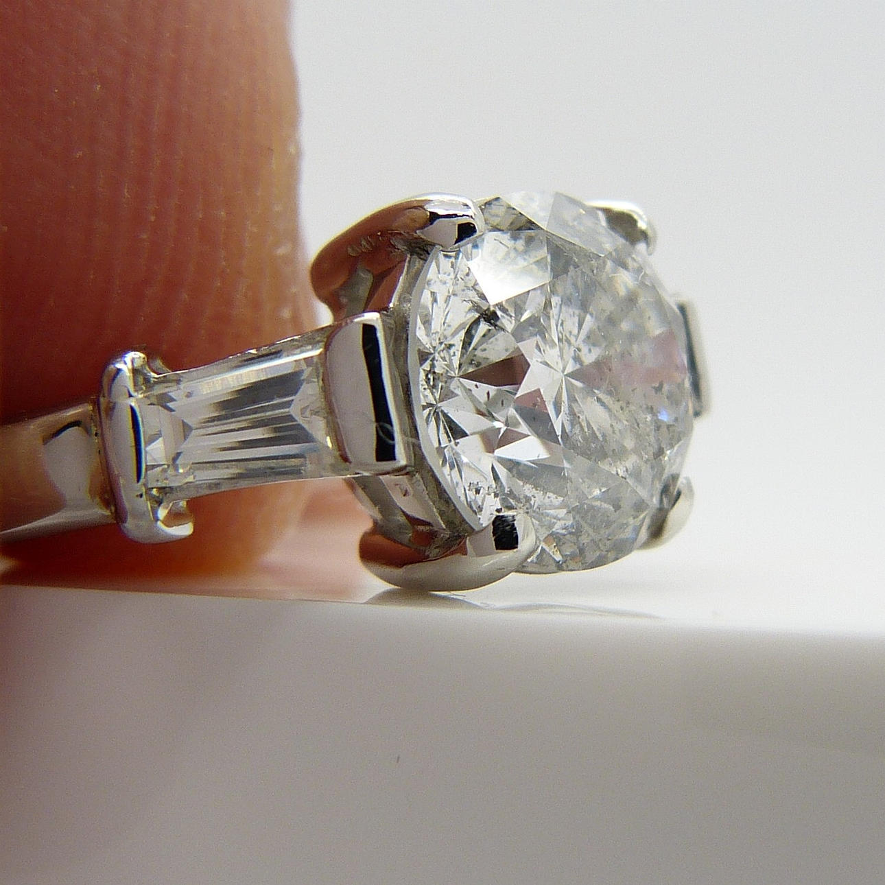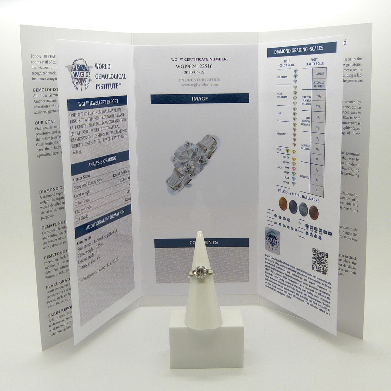 ENSTENSRING platina 2.63 ct diamant, med en central briljantslipad diamant samt avsmalnande baguettdiamanter på axlarna.