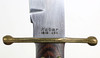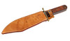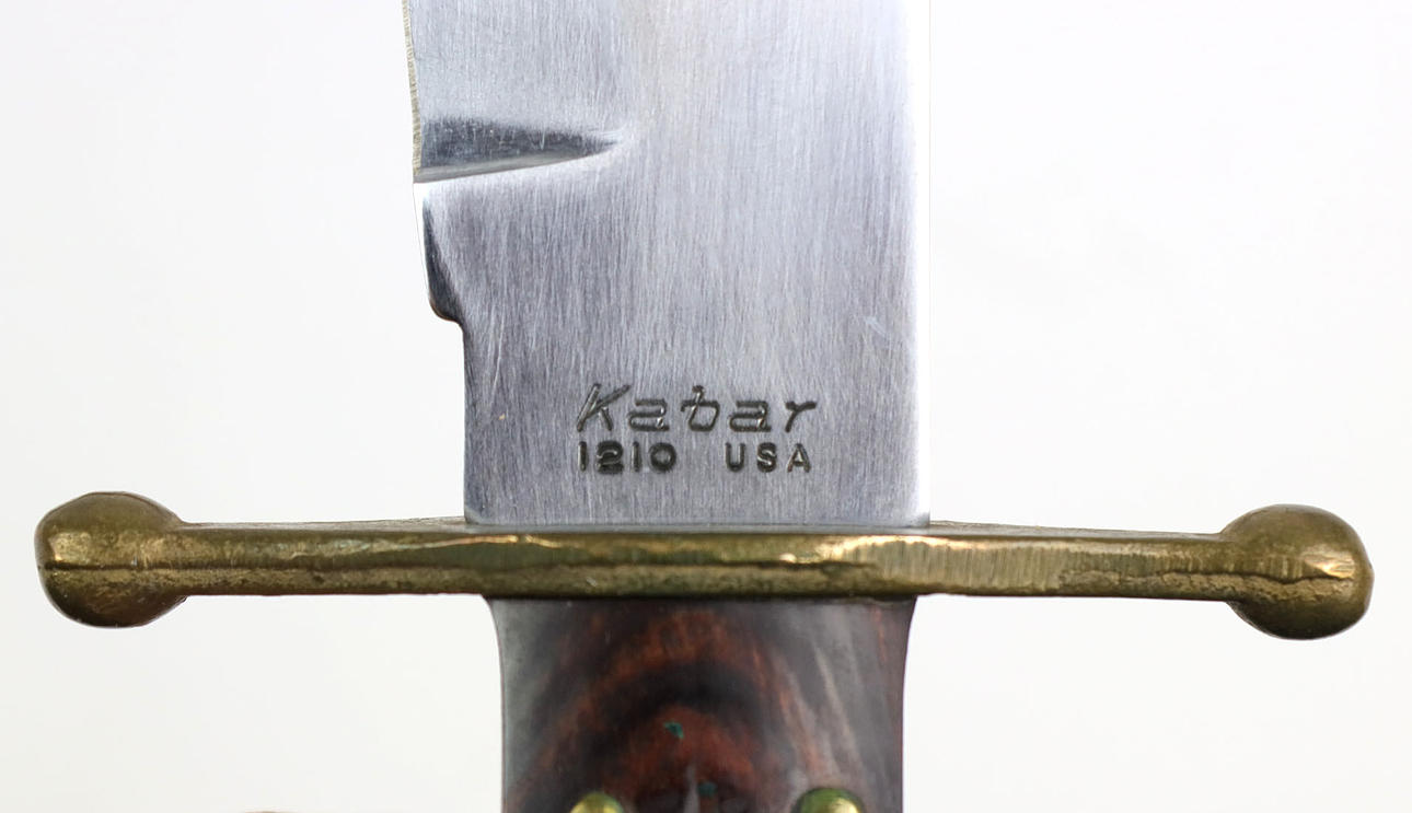 Avsmalnande krökt blad stämplat vid basen*Kabar 1210 USA*, längd ca. 21,5 cm, mätstång med kulände på båda sidor, längsgående räfflade trähandtagsvågar, total längd med lädermantel ca. 35,5 cm.