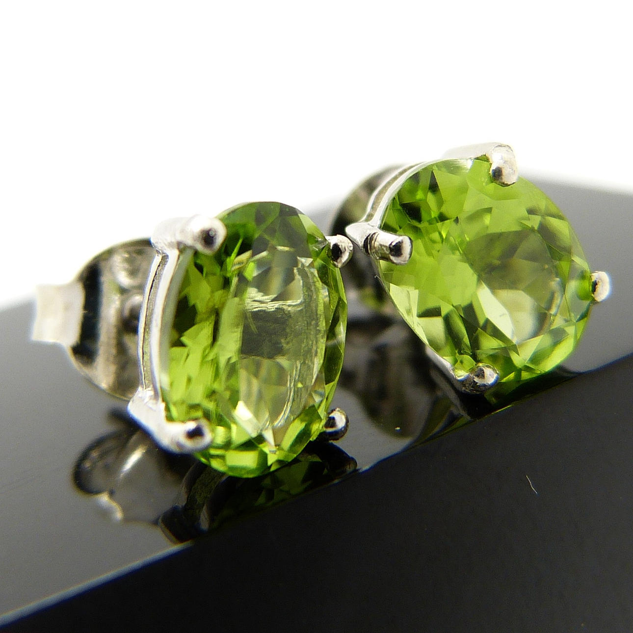 Varje tapp är inställd med en ovalslipad peridot ädelsten som mäter 7½ x 6 mm, ca.