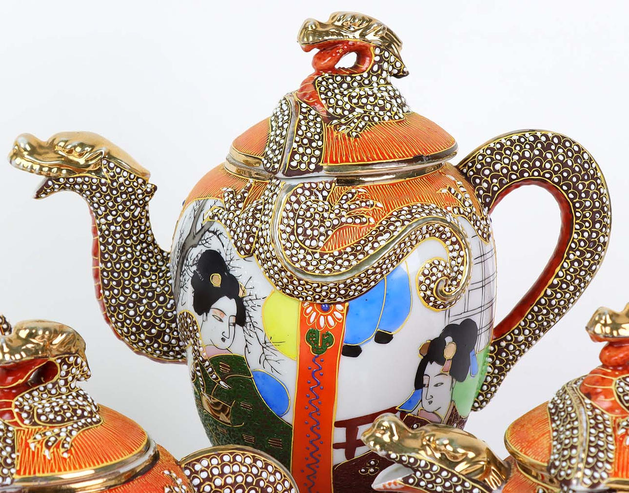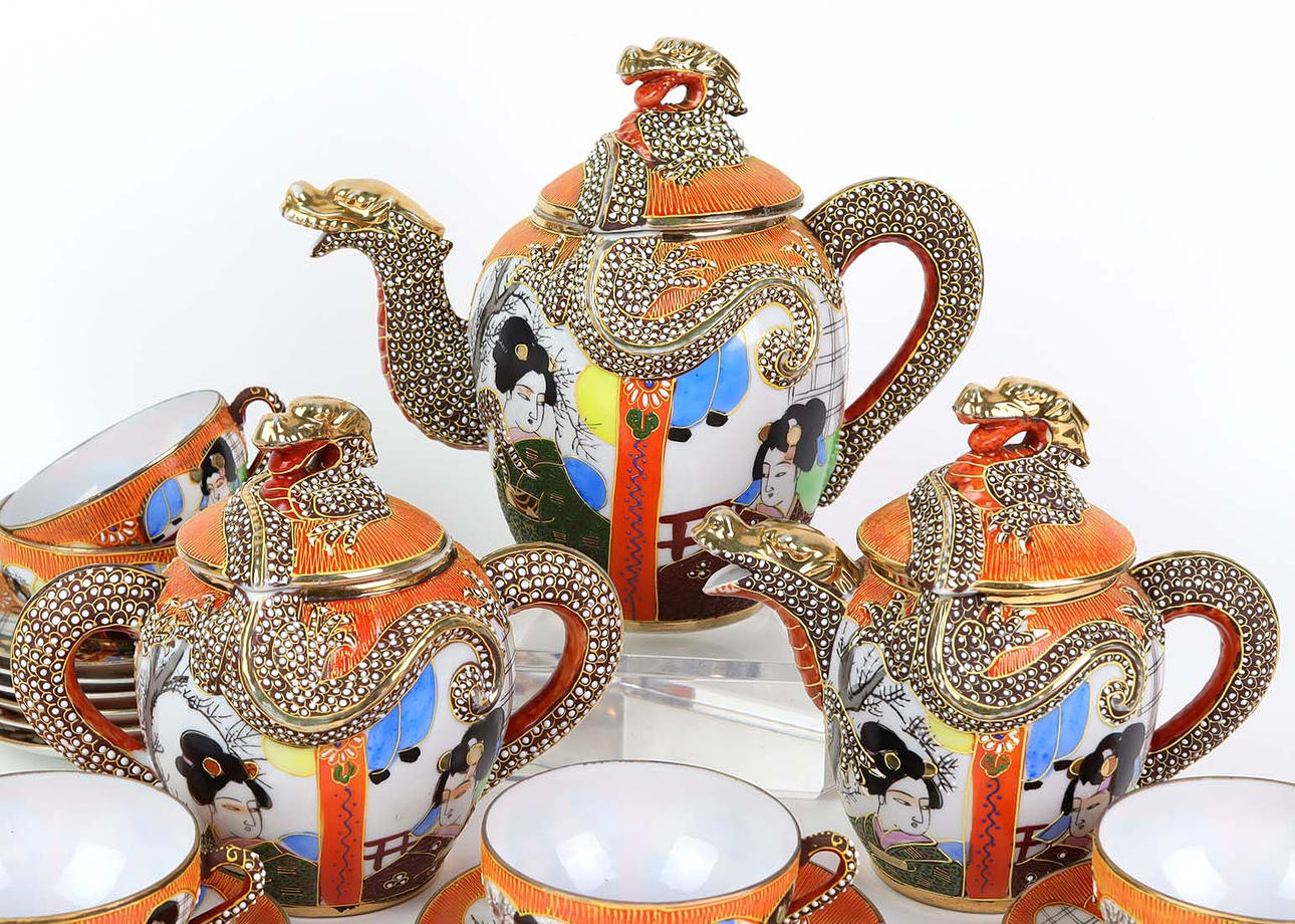 vitglaserat porslin med korallröd fabriksmärke, äggformad kropp rikt dekorerad med drakerelief, japansk personlig målning och prydnad på orange bakgrund, inklusive 5 koppar, 9 fat, 2 kannor och en lockbox, totalt 17 stycken, guld lätt gnuggade, i gott skick.