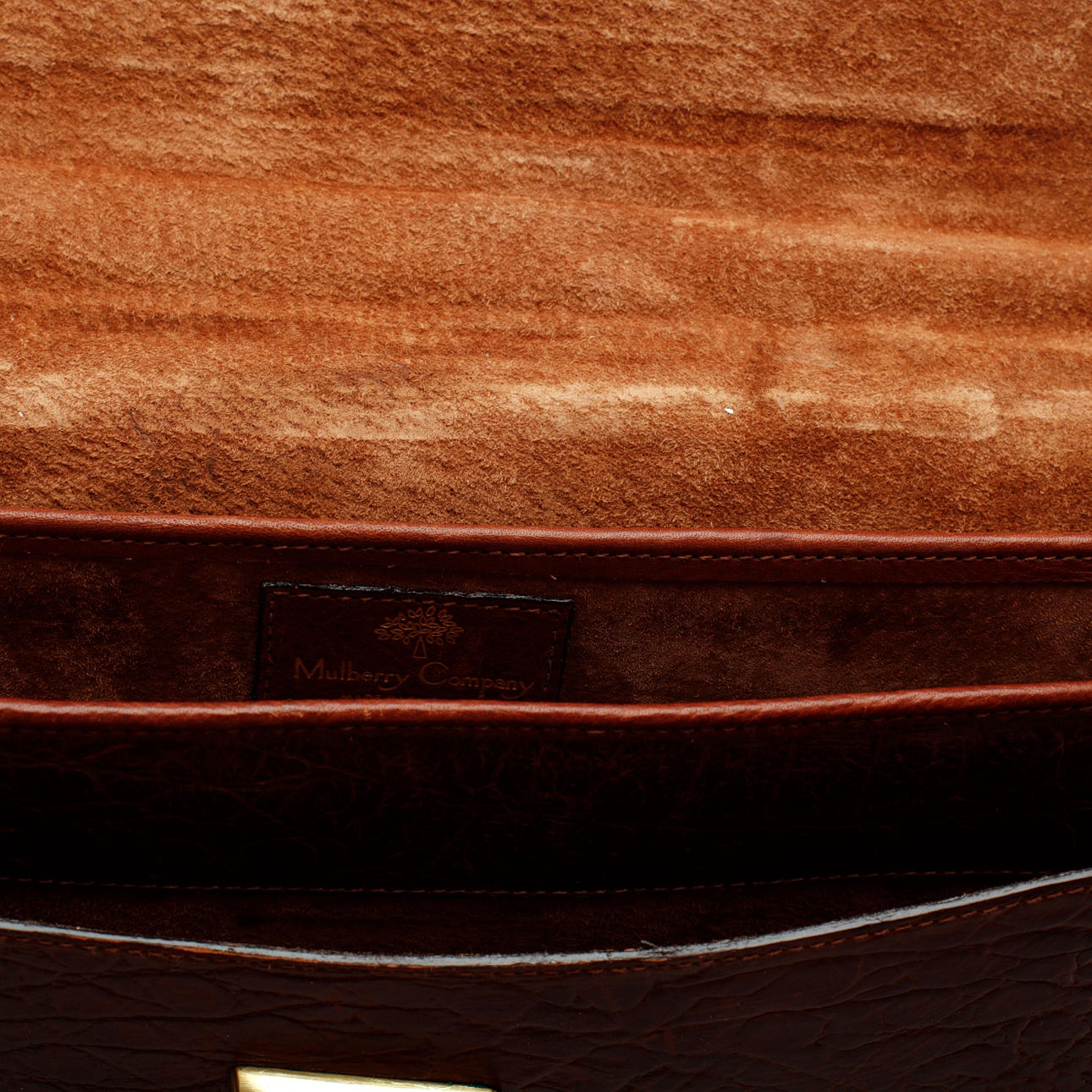Brunt kongoskinn med detaljer i mässing, märkt "Mulberry made in England", fack i skinn för pennor samt tre stora fack. Axelrem medföljer. 40 x29 x 4 cm.