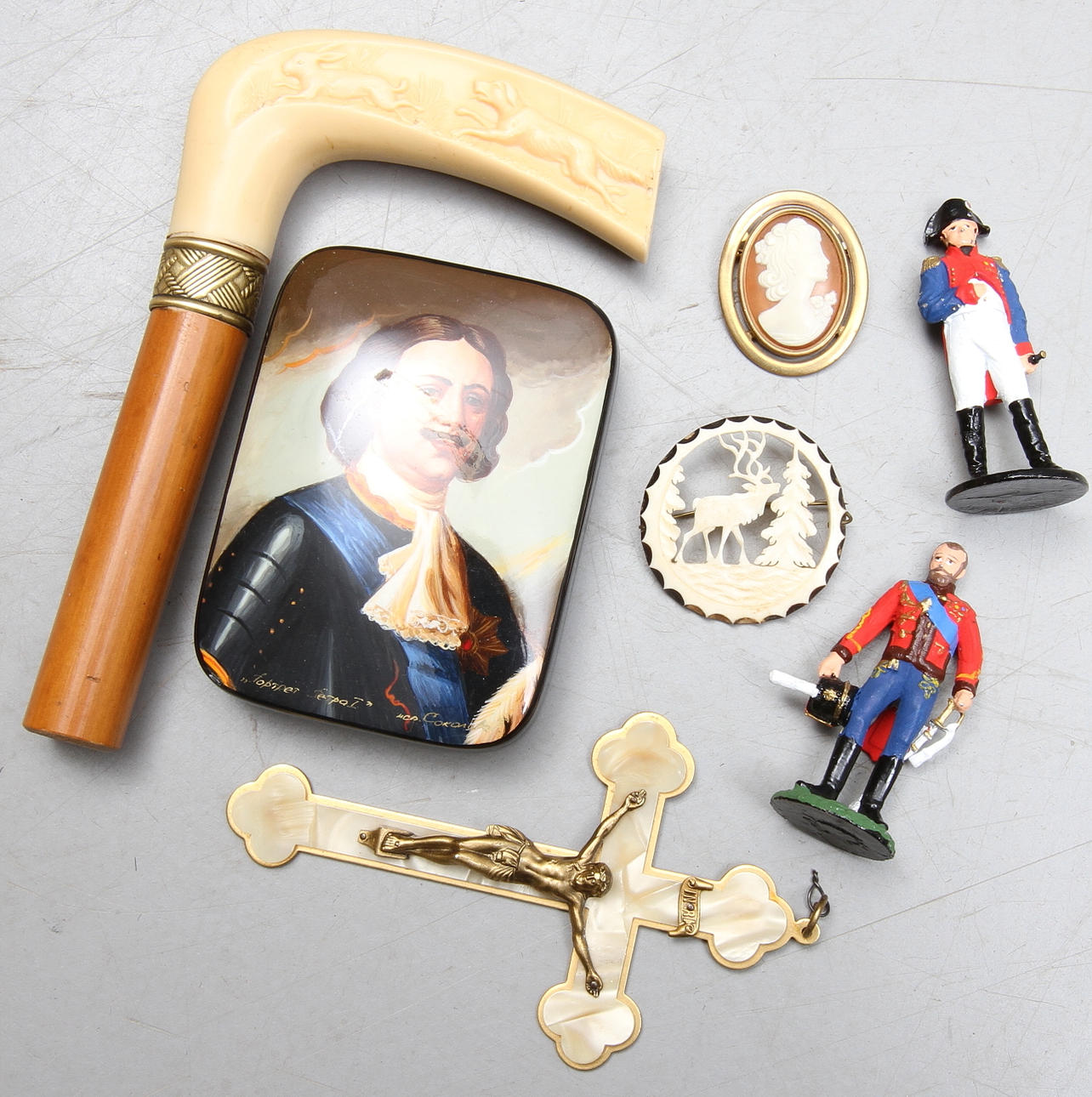 Bland annat kors, sparbössa, dosa, rakknivar, käppkrycka och figuriner.