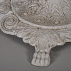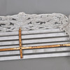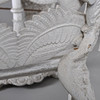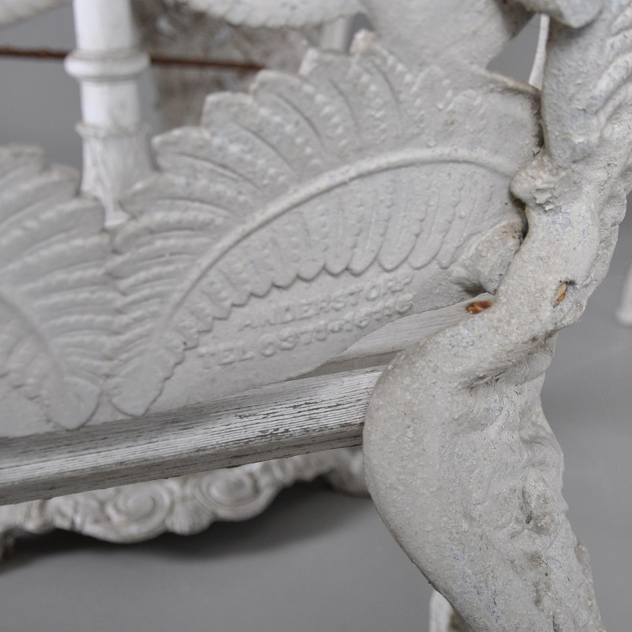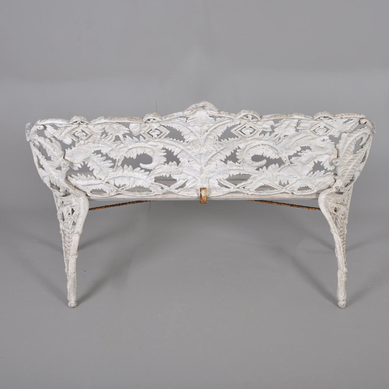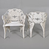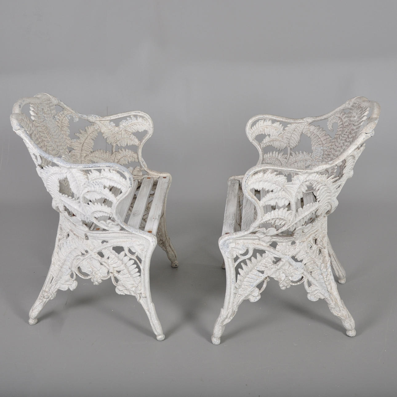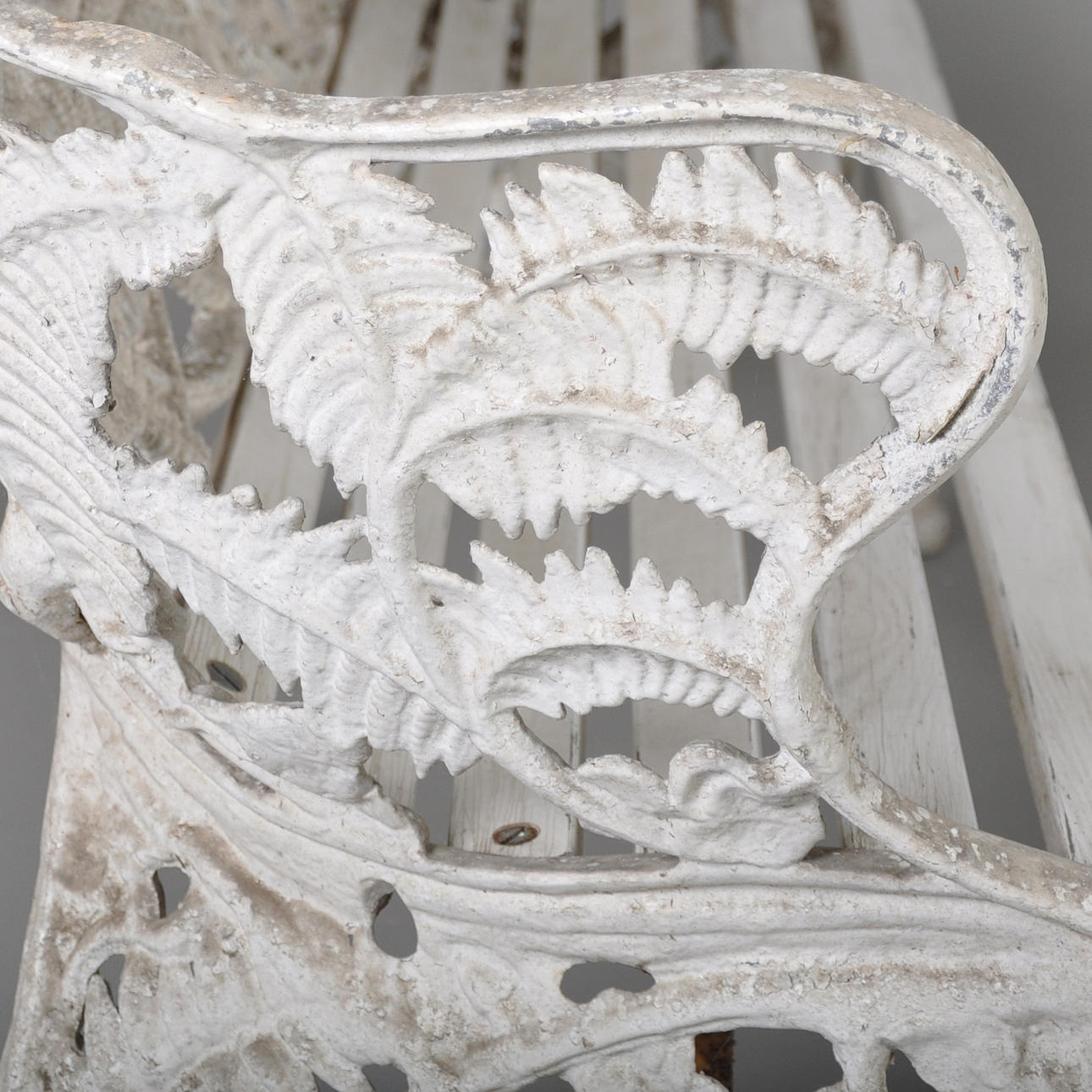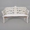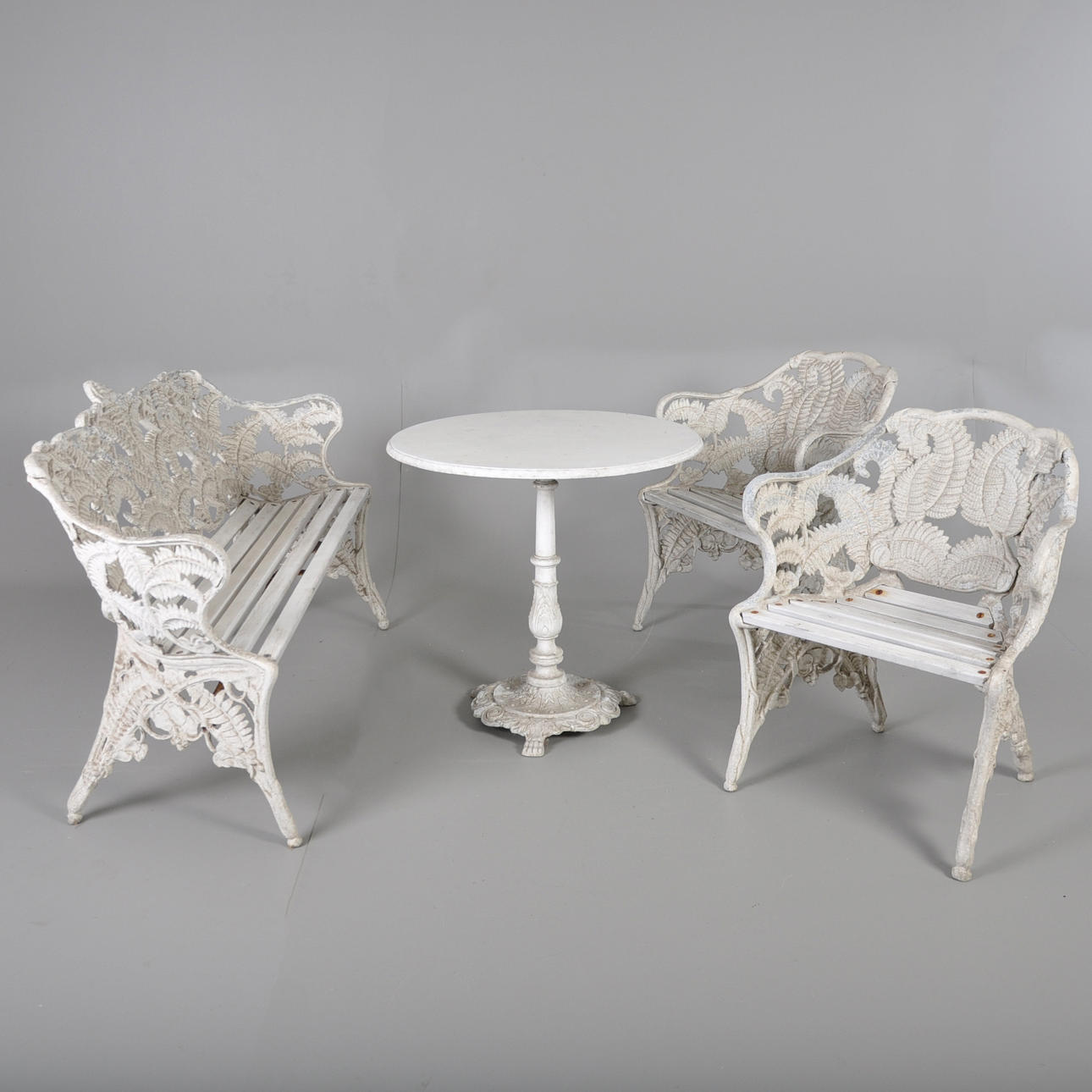 Gjutgods. Genombruten dekor av ormbunkar. Sits av träribbor. Längd soffa 140 cm Bredd fåtöljer 70 cm.