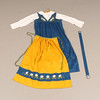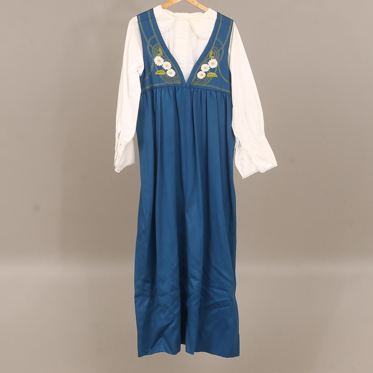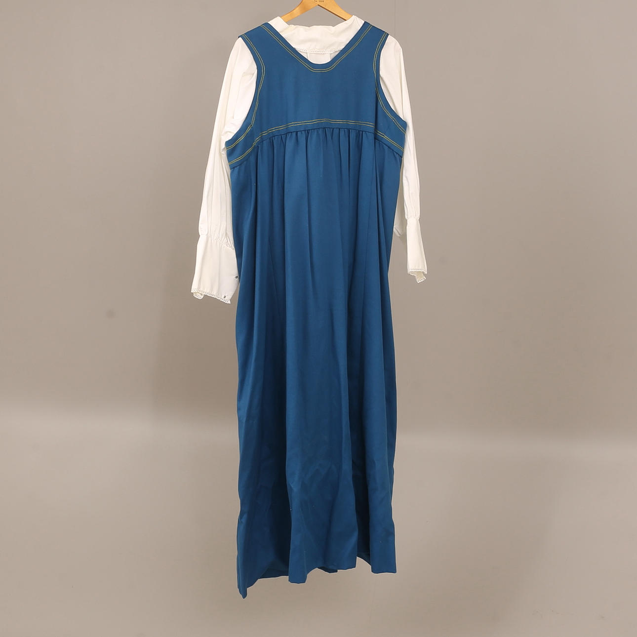 Blus, klänning, förkläde, bälte. Klänningens totala längd cirka 148 cm.