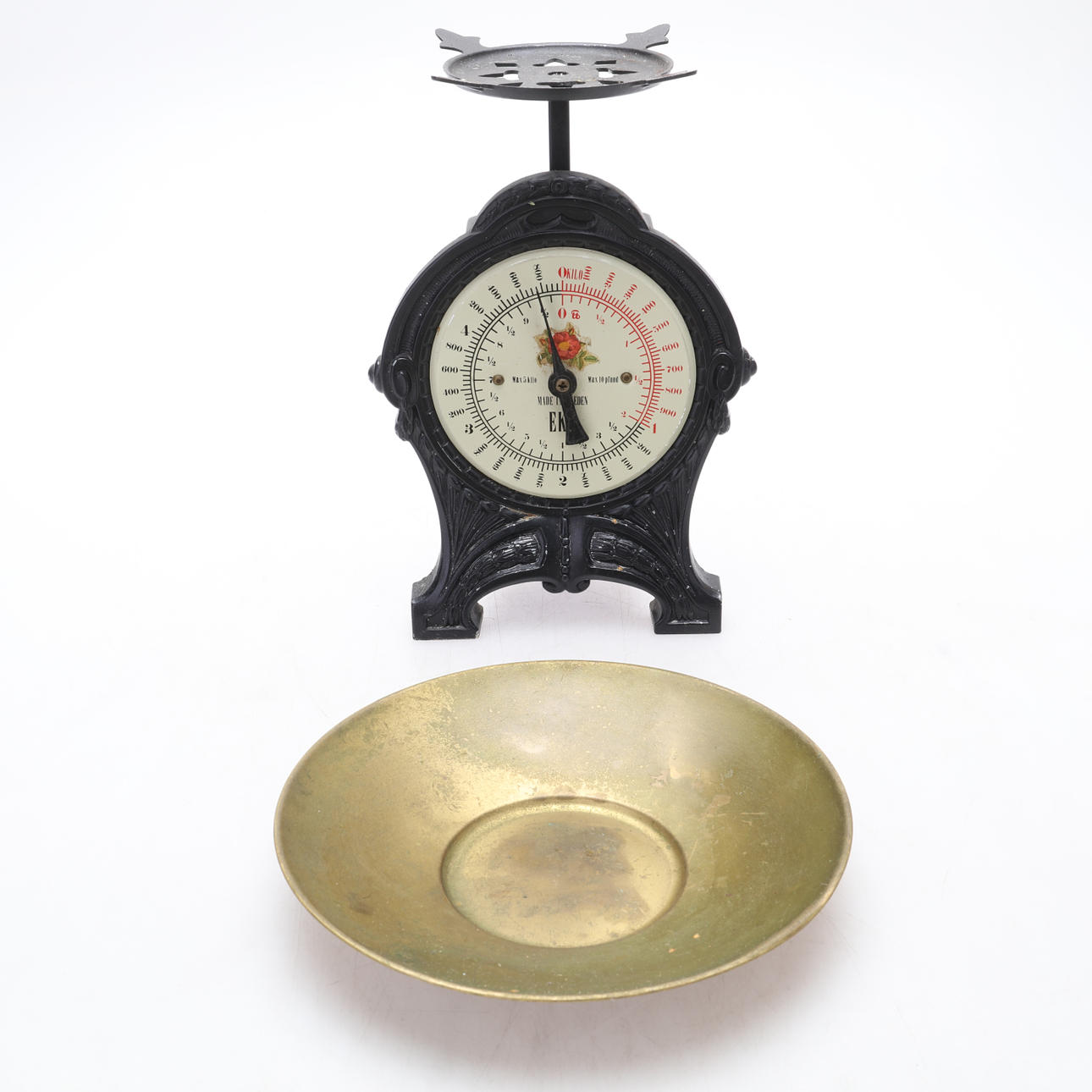 Höjd: 31 cm. Bredd: 20 cm. Djup: ca 10 cm. Vågskål: diameter: ca 23 cm.