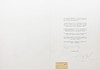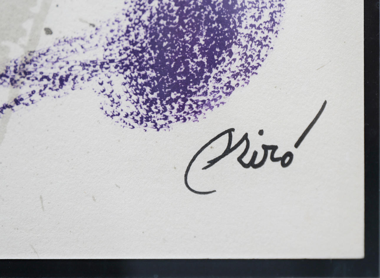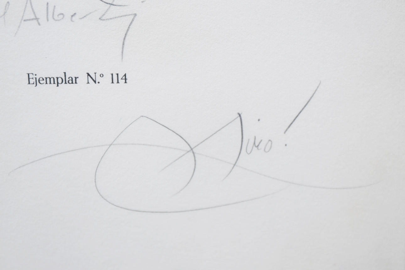 Signerad på plåten. Tillverkad 1975. Det är en del av Rafael Albertis ”Underverk med akrostiska variationer i Miró Garden”. På baksidan av ramen, sidan som motiverar utgåvan av volymen, signerad av Joan Miró och Rafael Alberti och numrerad 114/300