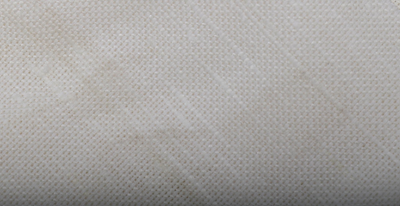 Det vita tygstycket med måttet 250x125 har hanteringssfläckar efter att suttit på rulle.
