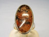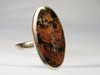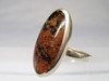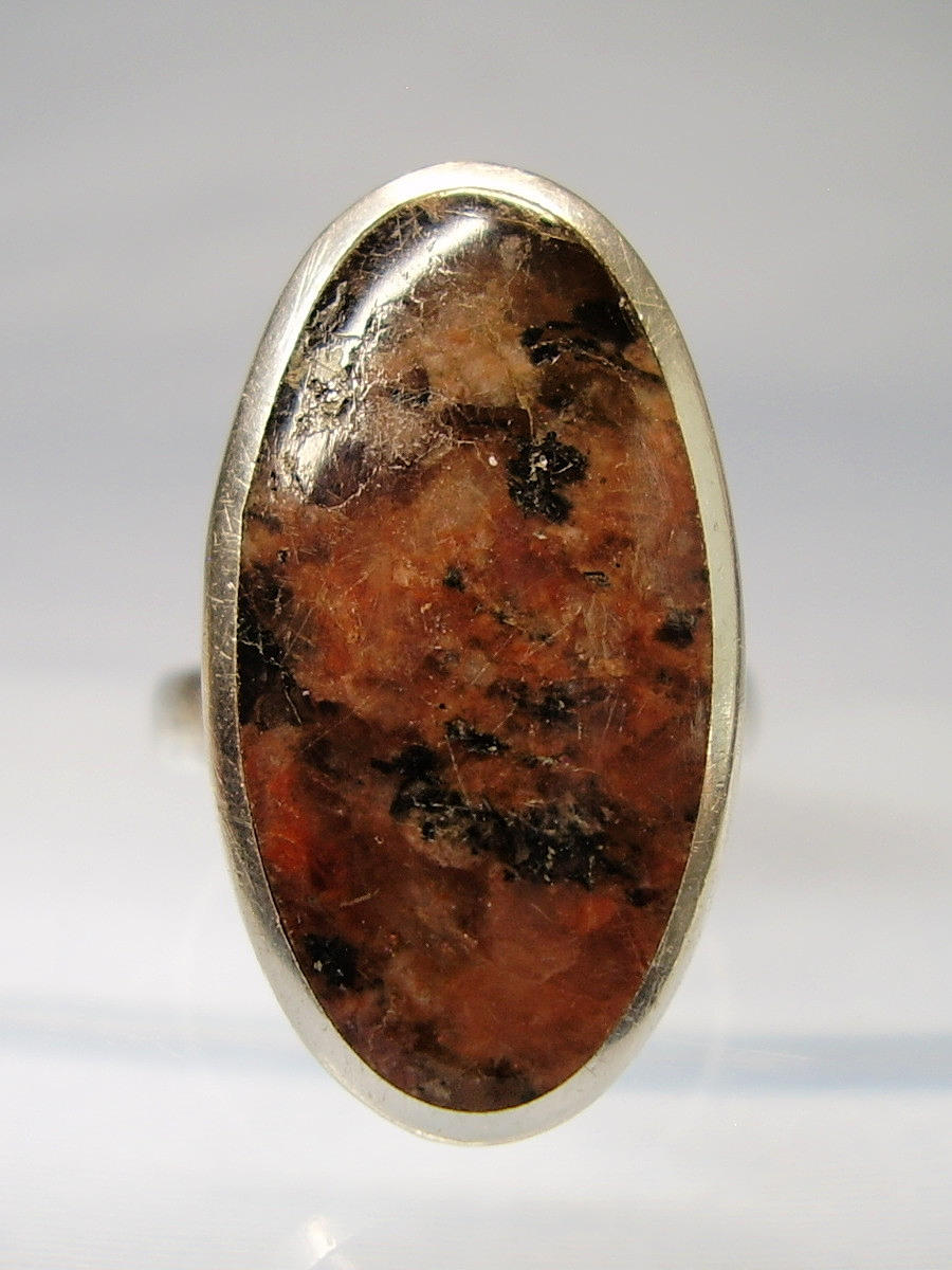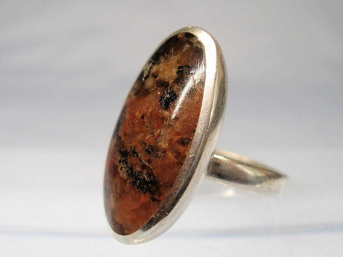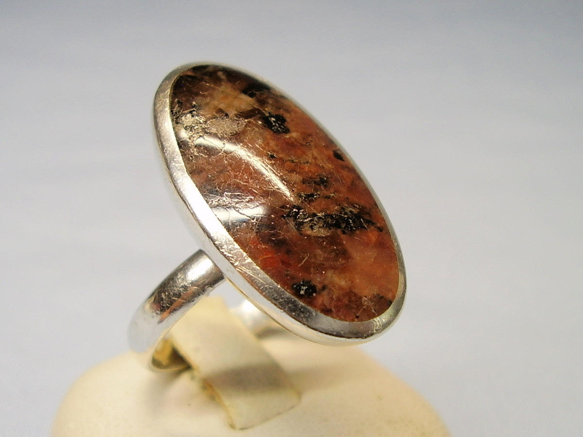 Den ovala, brun marmorerad sugilit cabochon hålls fast av en slät ram och sitter på en silverplatta för skydd. Cabochon är finpolerad och har en vacker glans.